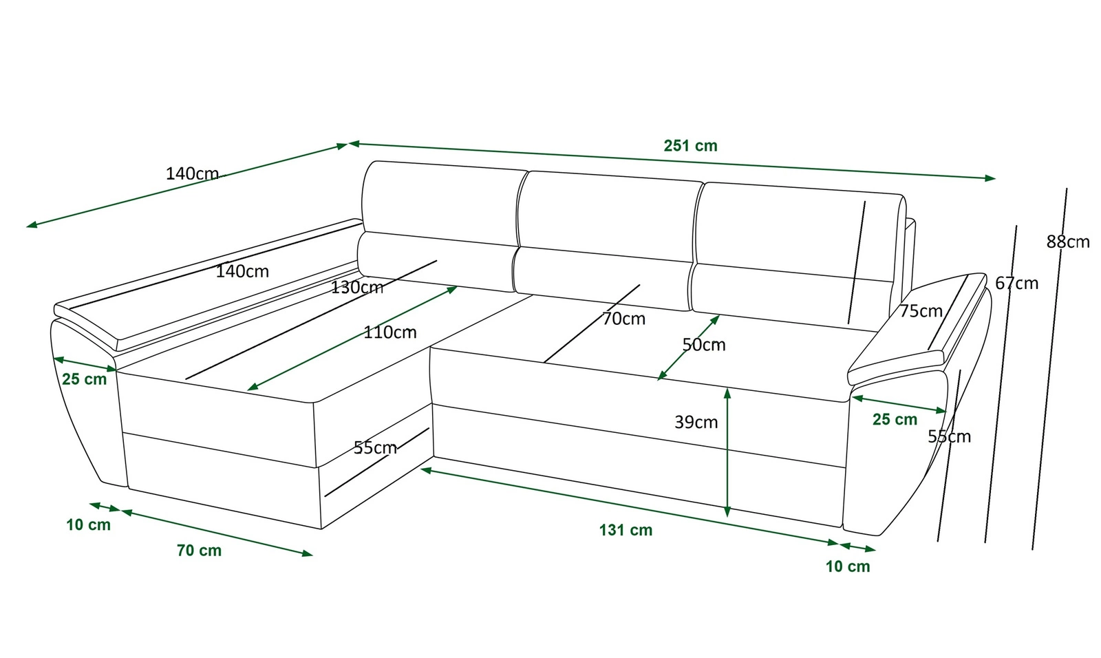 Das Ecksofa mit Schlaffunktion eignet sich dank seiner Abmessungen und seiner breiten Funktionalität ideal als Ecksofa für das Wohnzimmer oder als klappbares Ecksofa für das Gästezimmer. Ein Ecksofa mit Schlaffunktion ist auch eine gute Alternative zu einem Bett im Zimmer der jugendzimmer. Breite der Ecke 251 cm, höhe 88 cm und Tiefe 140 cm. Die Liegefläche des Eckschrankes beträgt 130x200 cm. Die Sitzhöhe des Möbels beträgt 39 cm, und die Höhe der Rückenlehne beträgt 47 cm. Polyurethan-Schaumstoff T30 ist das Material, aus dem der Sitz der Ecke hergestellt ist. Weich rückenlehnen-Kissen gewährleisten einen hohen Komfort bei der täglichen Erholung, den Sie und Ihre Gäste, die auf diesem einzigartigen Ecksofa sitzen, zu schätzen wissen werden.