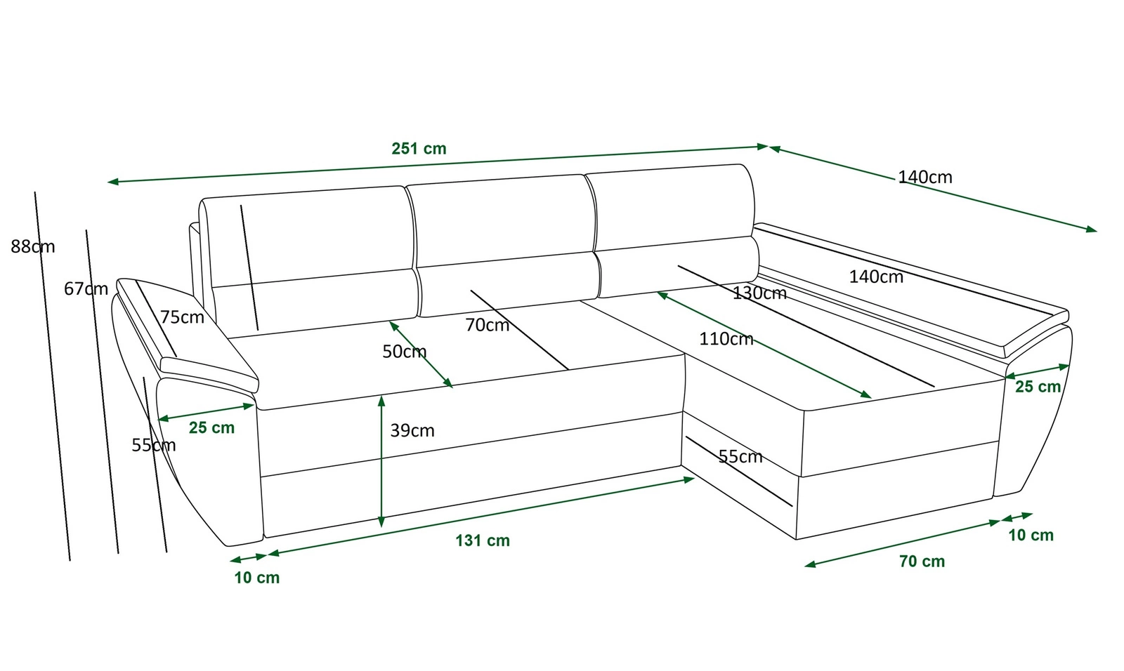Das Ecksofa mit Schlaffunktion eignet sich dank seiner Abmessungen und seiner breiten Funktionalität ideal als Ecksofa für das Wohnzimmer oder als klappbares Ecksofa für das Gästezimmer. Ein Ecksofa mit Schlaffunktion ist auch eine gute Alternative zu einem Bett im Zimmer der jugendzimmer. Breite der Ecke 251 cm, höhe 88 cm und Tiefe 140 cm. Die Liegefläche des Eckschrankes beträgt 130x200 cm. Die Sitzhöhe des Möbels beträgt 39 cm, und die Höhe der Rückenlehne beträgt 47 cm. Polyurethan-Schaumstoff T30 ist das Material, aus dem der Sitz der Ecke hergestellt ist. Weich rückenlehnen-Kissen gewährleisten einen hohen Komfort bei der täglichen Erholung, den Sie und Ihre Gäste, die auf diesem einzigartigen Ecksofa sitzen, zu schätzen wissen werden.