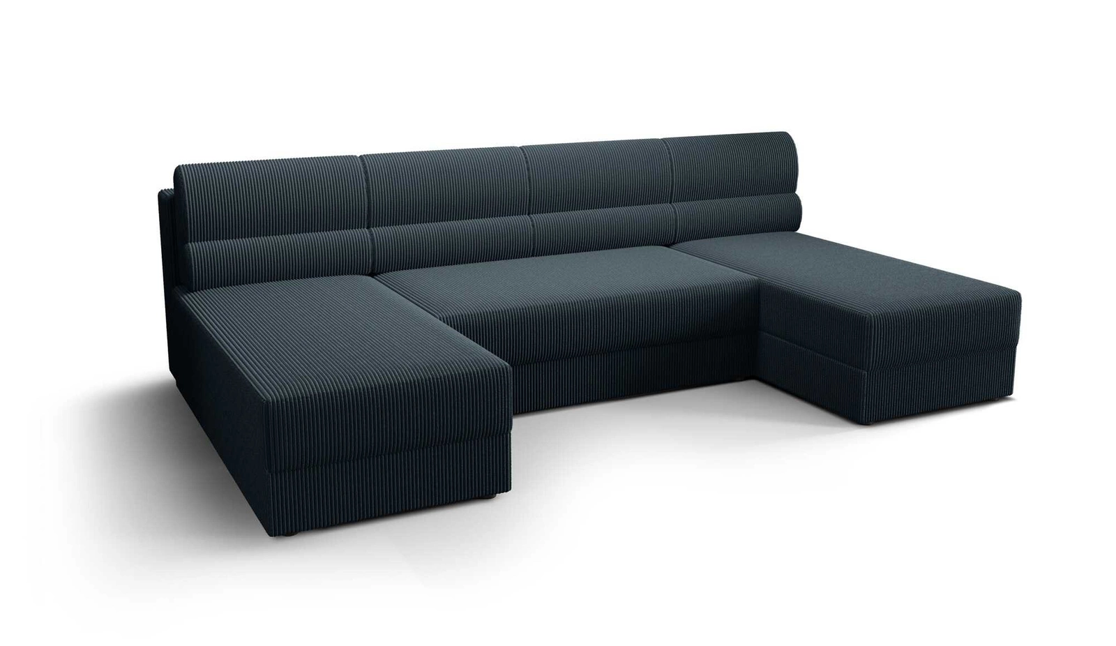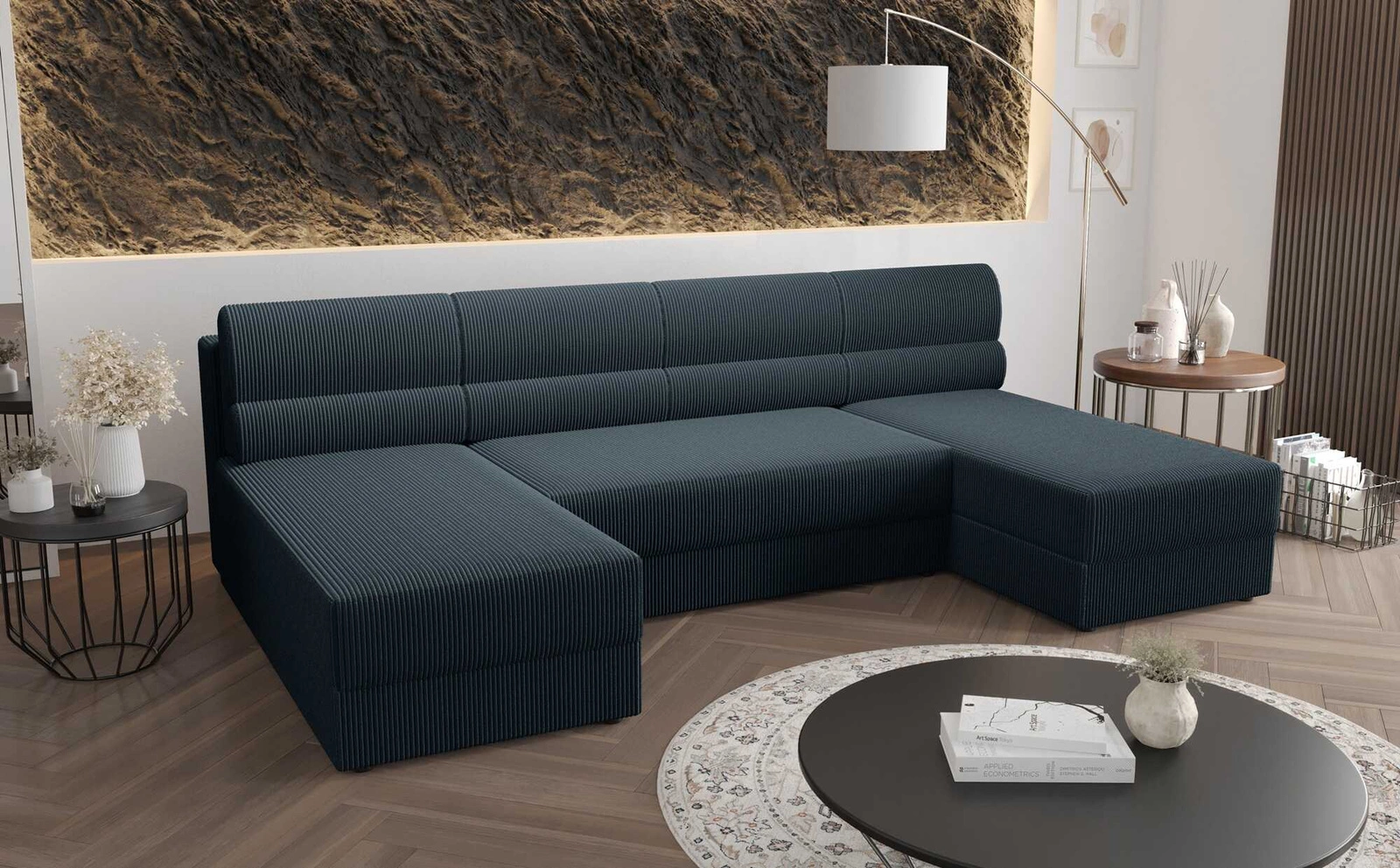 - Das Ecksofa Fogu U mit Schlaffunktion ist ein modernes und stilvolles Möbelstück in einer minimalistischen Form. Das Möbel ist mit einem Bettkasten ausgestattet und mit einem weichen und strapazierfähigen Kordstoff mit ausdrucksstarken und dicken Streifen