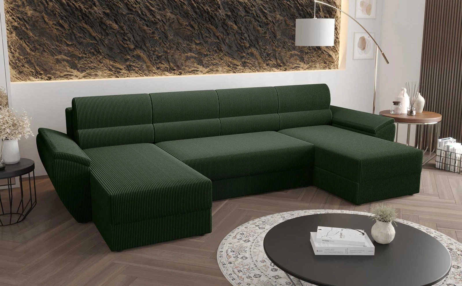 Ecksofa mit Schlaffunktion Fogu U II grün bequemes Ecksofa mit bequemen Armlehnen interessanter Designcontainer für Bettwäsche
