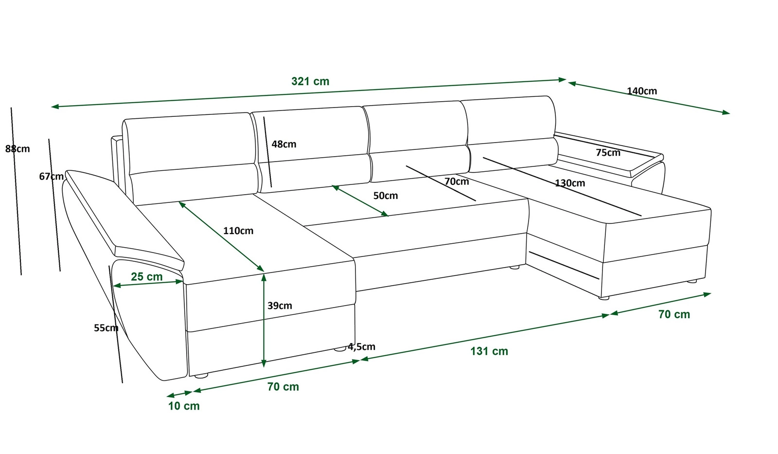 Das Ecksofa mit Schlaffunktion eignet sich dank seiner Abmessungen und seiner breiten Funktionalität ideal als Ecksofa für das Wohnzimmer oder als klappbares Ecksofa für das Gästezimmer. Ein Ecksofa mit Schlaffunktion ist auch eine gute Alternative zu einem Bett im Zimmer der jugendzimmer. Breite der Ecke 321 cm, höhe 88 cm und Tiefe 140 cm. Die Liegefläche der Eckeinheit beträgt 130x270 cm. Die Sitzhöhe des Möbels beträgt 39 cm, und die Höhe der Rückenlehne beträgt 48 cm. Polyurethan-Schaumstoff T30 ist das Material, aus dem der Sitz der Ecke hergestellt ist. Weich rückenlehnen-Kissen gewährleisten einen hohen Komfort bei der täglichen Erholung, den Sie und Ihre Gäste, die auf diesem einzigartigen Ecksofa sitzen, zu schätzen wissen werden.