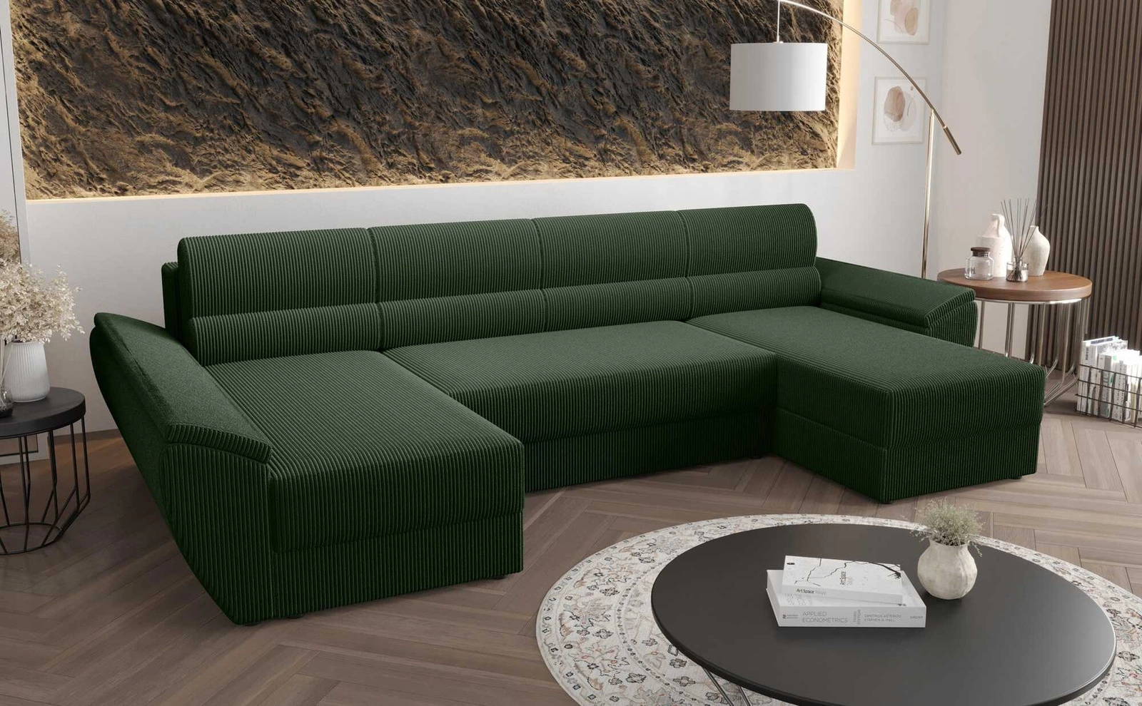 Ecksofa mit Schlaffunktion Fogu U III grün stilvolles Ecksofa mit Armlehnen und Bettzeugablage Kordelstoff