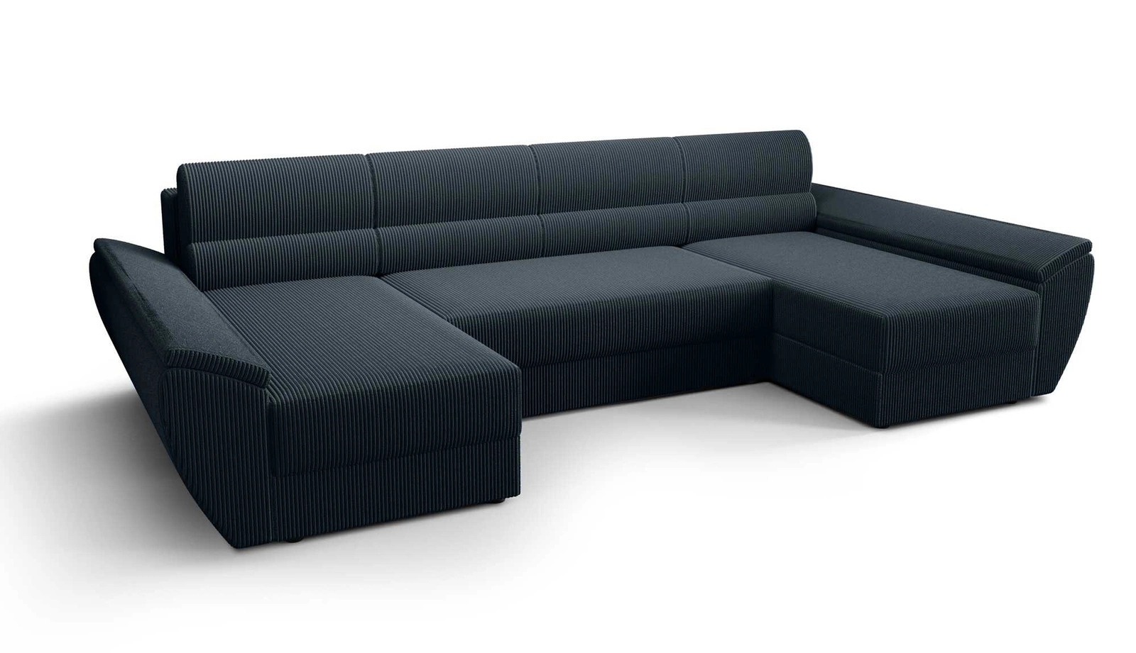 • Fogu U IV Ecksofa mit Schlaffunktion ist ein stilvolles Möbelstück in minimalistischer Form. Das Möbelstück ist mit einem Bettkasten und breiten Armlehnen ausgestattet und mit einem weichen und strapazierfähigen Kordstoff mit ausdrucksstarken und dicken S