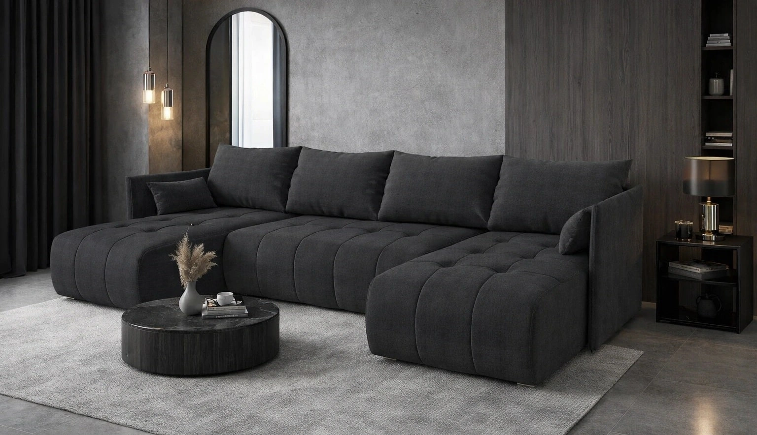Ecksofa mit Schlaffunktion Selva U dunkelgrau Interessant präsentiertes Ecksofa aus strapazierfähigem Webstoff