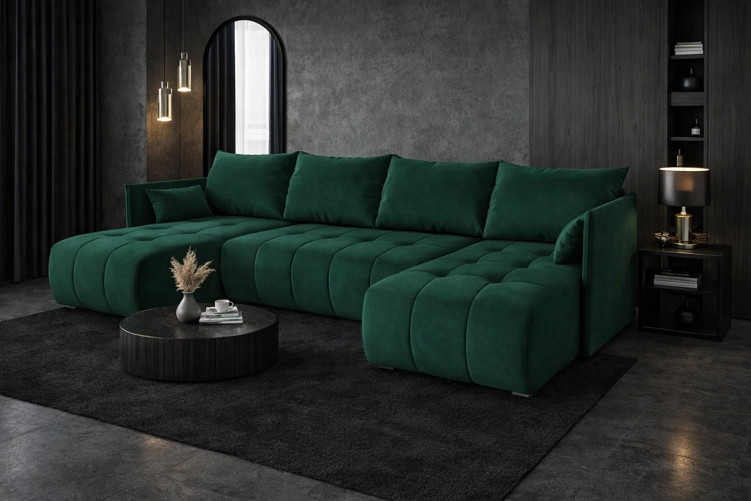 Ecksofa mit Schlaffunktion Selva U Flasche grün Interessantes Ecksofa aus weichem Samtstoff