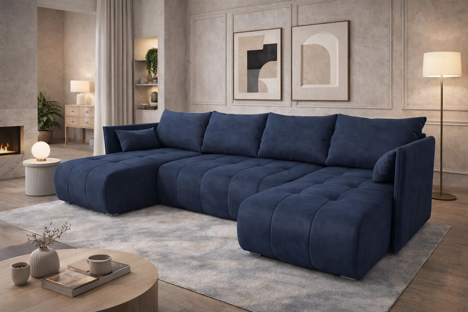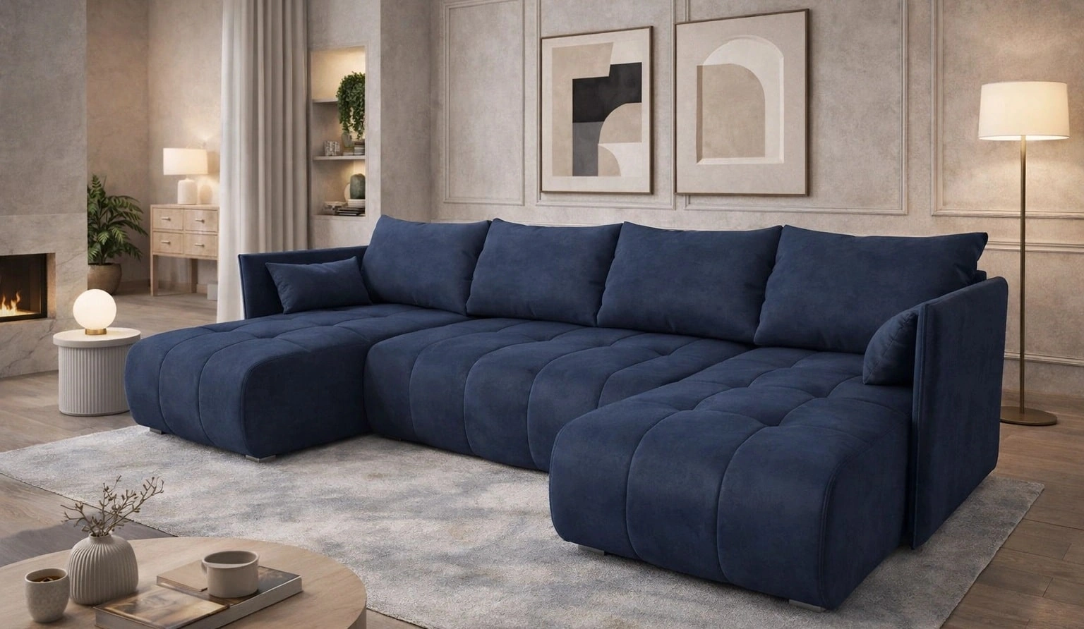 - Das Ecksofa Selva U mit Schlaffunktion ist ein interessantes Möbelstück, das sich perfekt in die aktuellen Einrichtungstrends einfügt. Wohnzimmerecksofa aus angenehmem Samtstoff mit interessanter Textur, die dem Sofa eine einzigartige Schönheit verleiht.