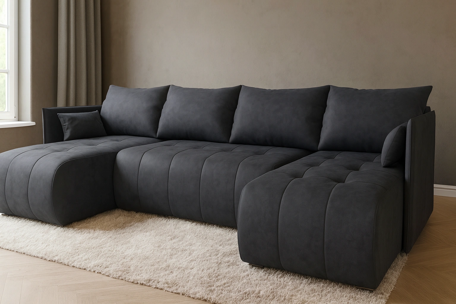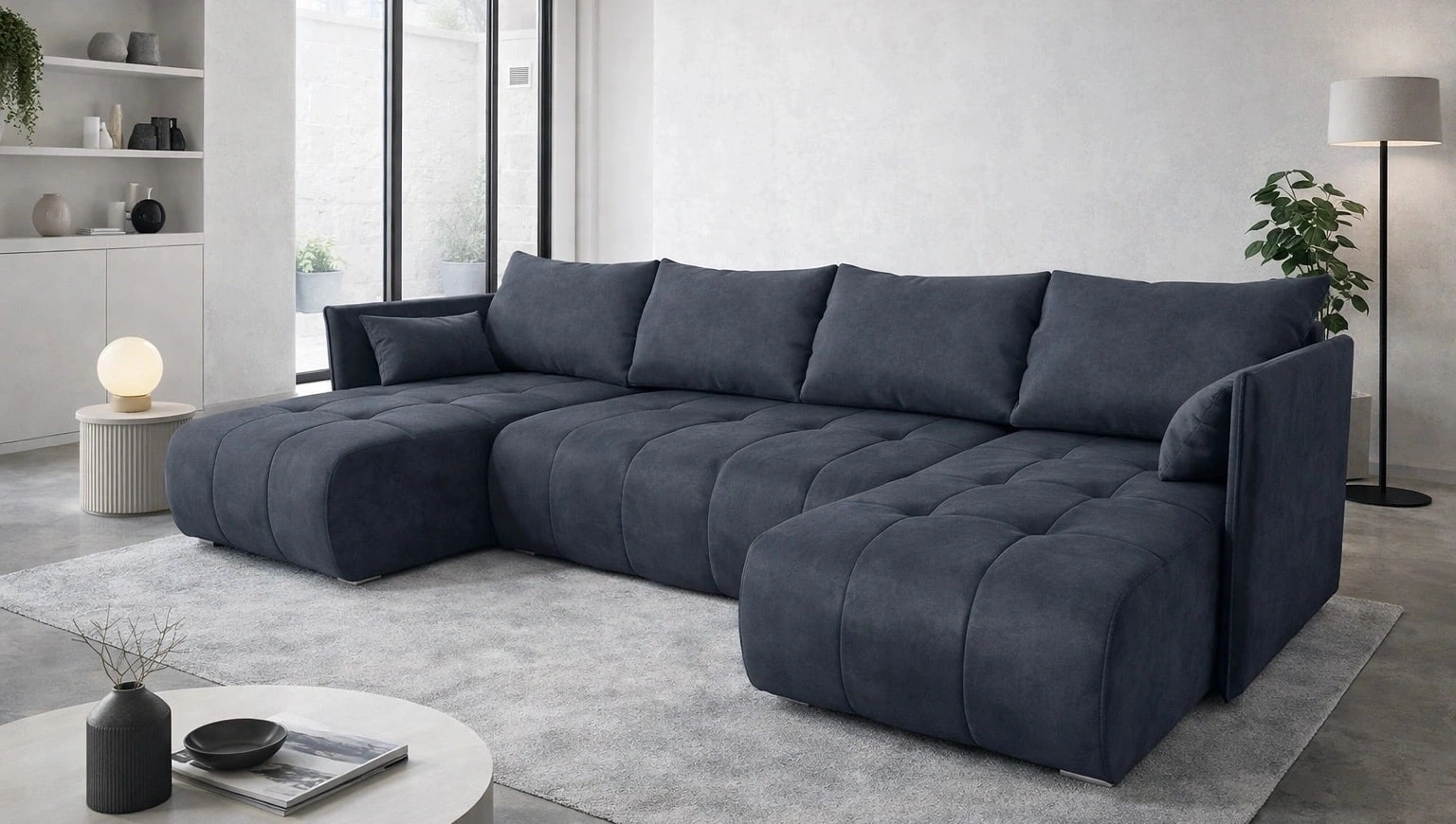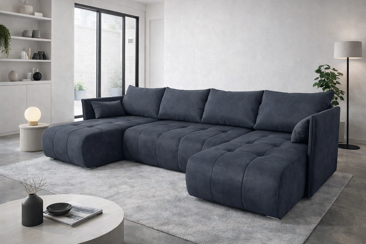 - Das Ecksofa Selva U mit Schlaffunktion ist ein interessantes Möbelstück, das sich perfekt in die aktuellen Einrichtungstrends einfügt. Wohnzimmerecksofa aus angenehmem Samtstoff mit interessanter Textur, die dem Sofa eine einzigartige Schönheit verleiht.