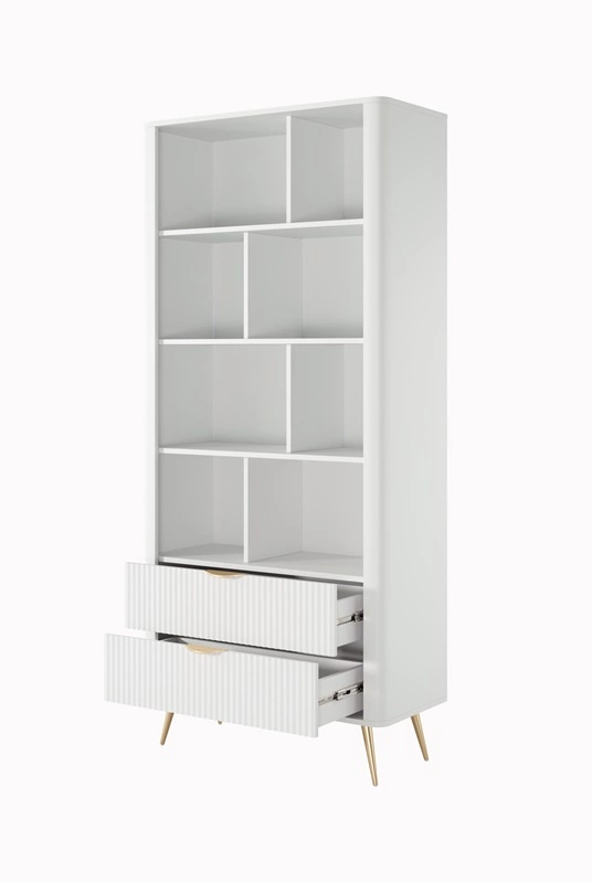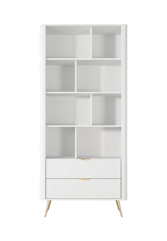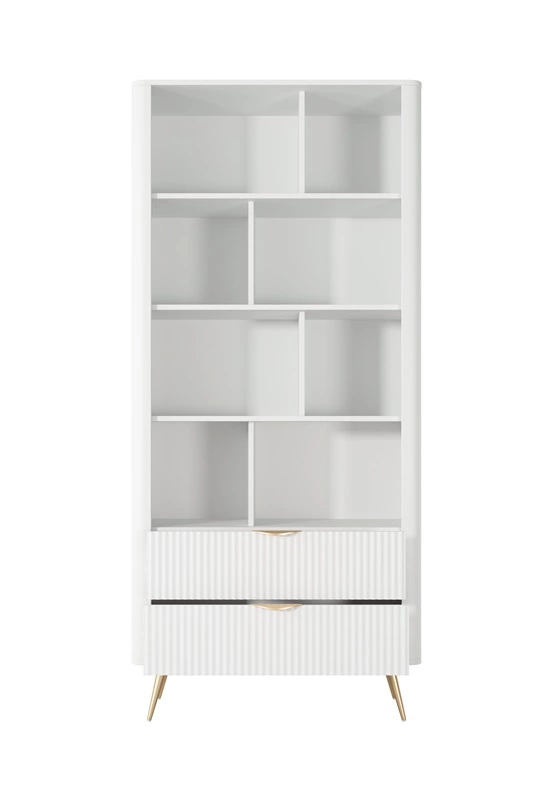 Bücherregal Lante ist ein reizvolles Möbelstück mit einem besonderen und einzigartigen Charakter. Eine ungewöhnliche Kombination aus zeitlosem Weiß mit einer ovalen Körperform macht den gesamten Look dezent und sehr stilvoll. Geriffelte Fronten und randklammern verleihen Finesse und Eleganz und sind zudem eine auffällige Dekoration. Geräumige Schubladen stauraum für all Ihre Habseligkeiten und wichtigen Accessoires. Das einzigartige Design des Bücherregals funktioniert auch im das anspruchsvollste Interieur.