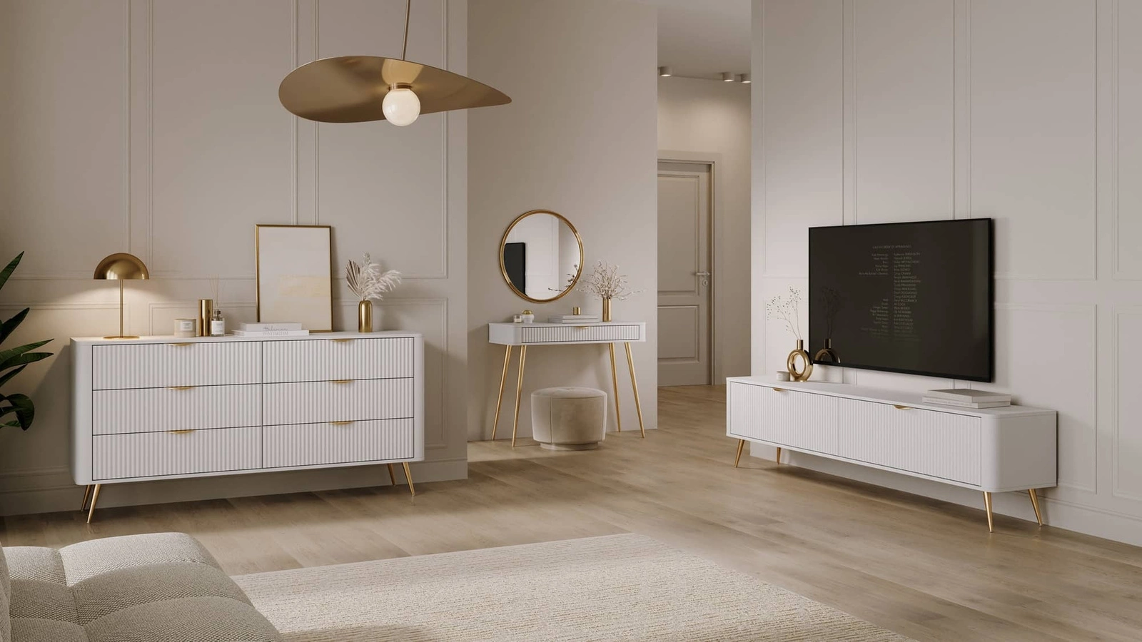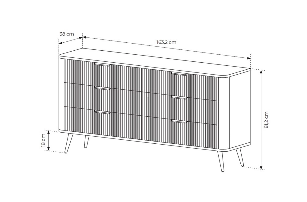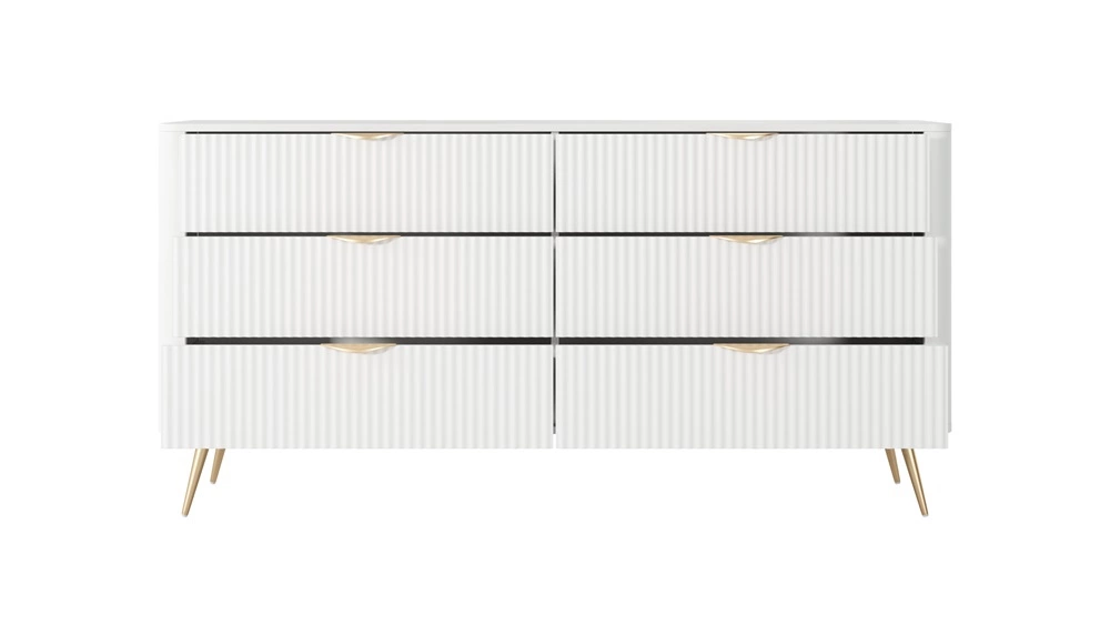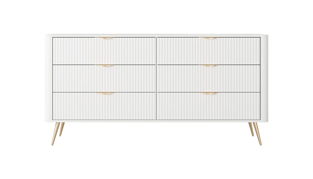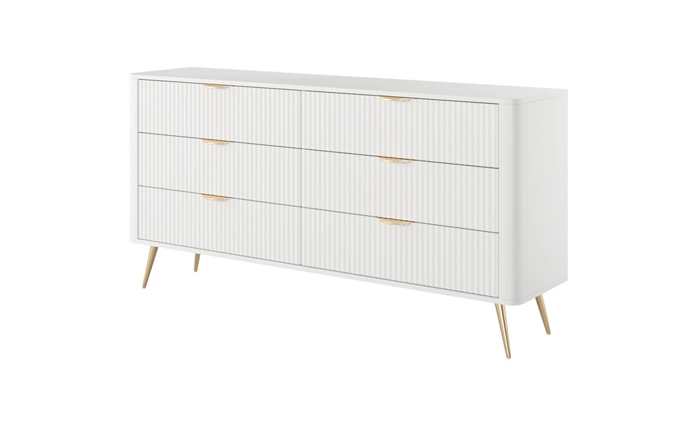 Geriffelte Schubladenfronten wurden hergestellt aus mDF. Der Korpus der Kommode besteht aus hochwertige 16 mm dicke laminierte Platte, die resistent gegen äußere Einflüsse wie Druckstellen, Stöße und unglückliche Kratzer ist. Die Struktur der Möbel wurde mit mit Gold metallbeine. Präzise Verarbeitung und Liebe zum Detail dafür sorgen, dass die Kommode viele Jahre lang ihr schönes Aussehen behält, ohne an Funktionalität zu verlieren.