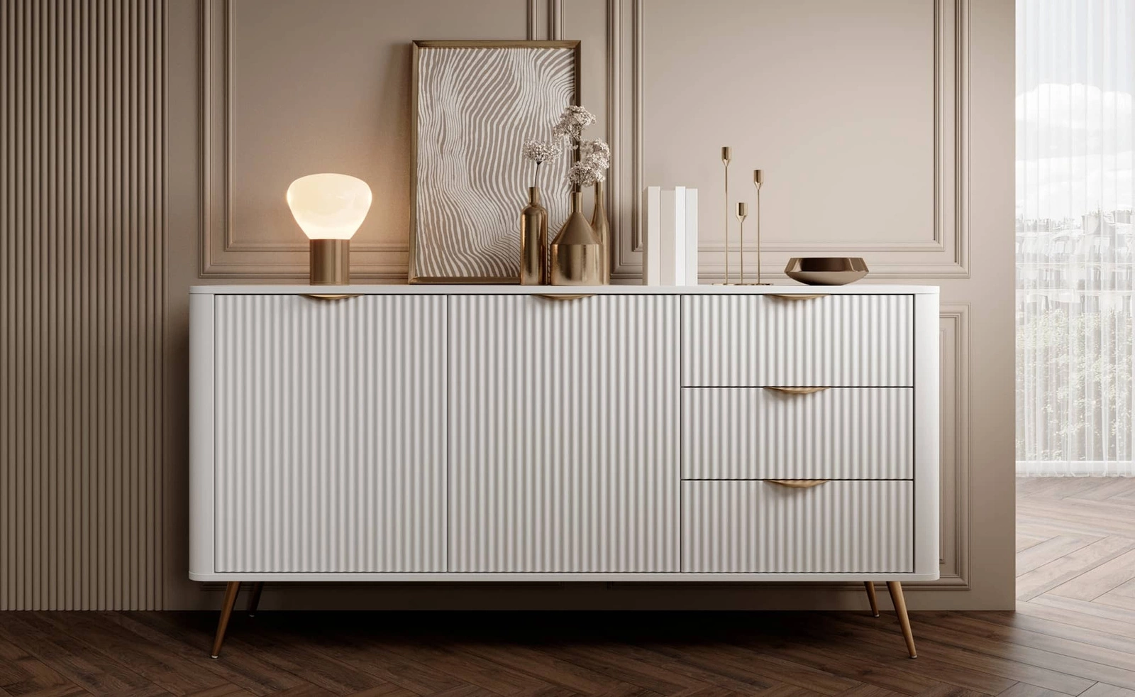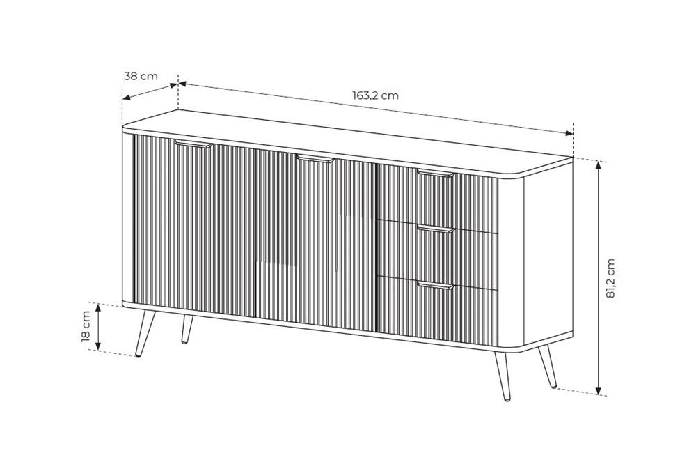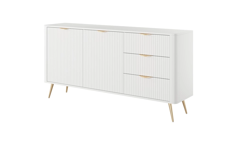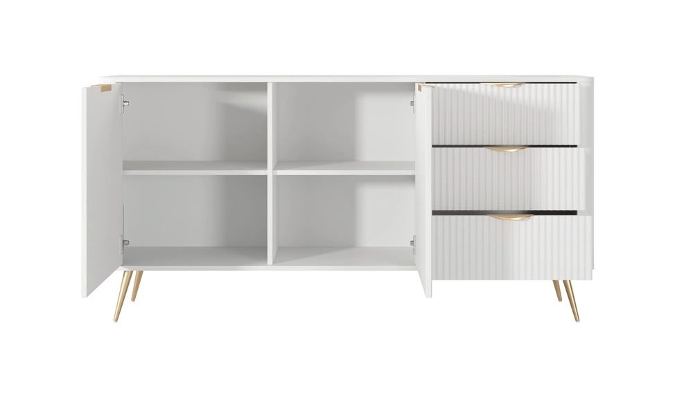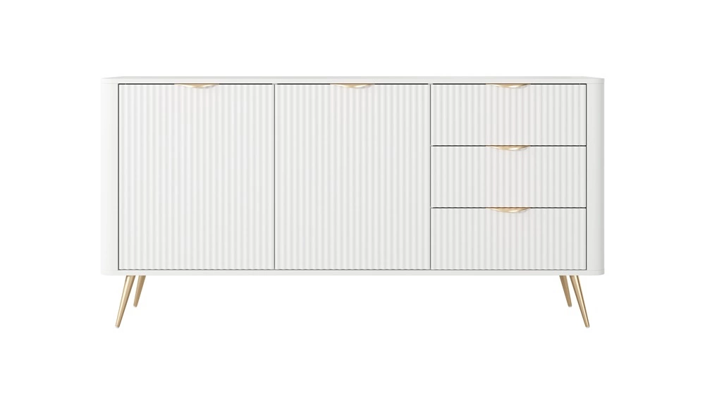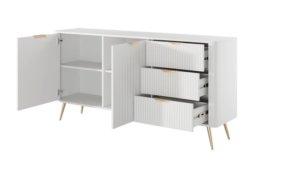 Geriffelte Fronten wurden hergestellt aus mDF. Der Korpus der Kommode ist gefertigt aus hochwertige 16 mm dicke laminierte Platte, die resistent gegen äußere Einflüsse wie Druckstellen, Stöße und unglückliche Kratzer ist. Die Struktur der Möbel wurde mit mit Gold metallbeine. Präzise Verarbeitung und Liebe zum Detail dafür sorgen, dass die Kommode viele Jahre lang ihr schönes Aussehen behält, ohne an Funktionalität zu verlieren.