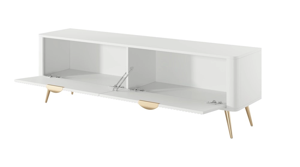 Geriffelte Fronten wurden hergestellt aus mDF. Das Gehäuse des RTV-Schrankes besteht aus hochwertige 16 mm dicke laminierte Platte, die resistent gegen äußere Einflüsse wie Druckstellen, Stöße und unglückliche Kratzer ist. Die Struktur der Möbel wurde mit mit Gold metallbeine. Präzise Verarbeitung und Liebe zum Detail dafür sorgen, dass der TV-Schrank über viele Jahre hinweg sein schönes Aussehen behält, ohne an Funktionalität zu verlieren.