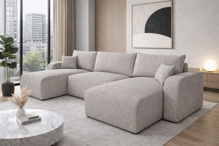 Ecksofa mit Schlaffunktion Fiesta U ist ein einfaches Möbelstück mit modernem Design, das sich perfekt in jede Inneneinrichtung einfügt. Das Sofa war vollständig mit einem Stoff des Typs kariert Neve 04. Ecksofa zeichnet sich aus durch hohe Verarbeitungsqualität, modernes Design, das durch die glatte Oberfläche des Sitzes und der Seitenwände hervorgehoben wird. Breite Armlehnen und goral rückenlehnen-Kissen sorgt für noch mehr Komfort und Bequemlichkeit bei dieser hochmodernen Eckeinheit.