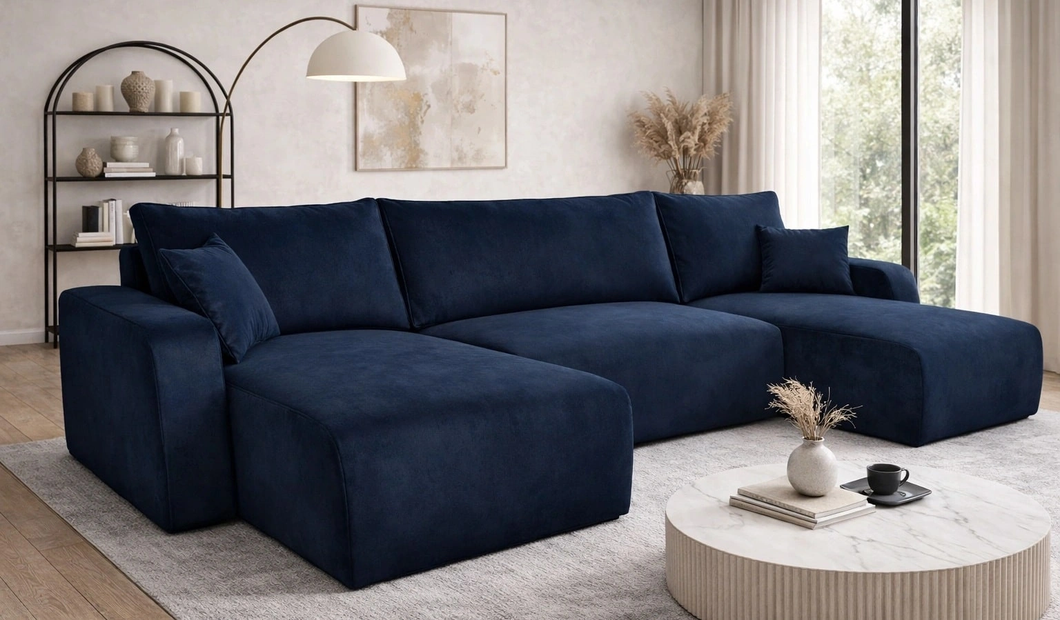 Ecksofa Fiesta U XL in Marineblau ist ein attraktives Möbelstück, das sich in jedem Raum Ihres Zuhauses gut macht.