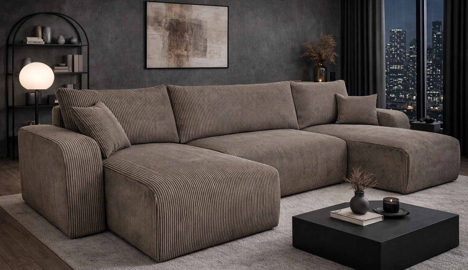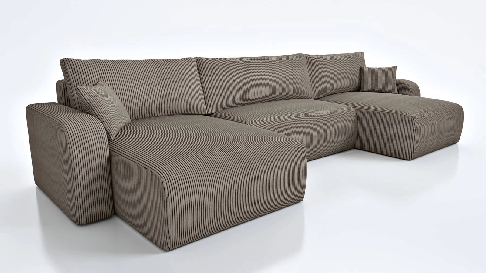 • Das Ecksofa Fiesta U XL zeichnet sich durch seine hohe Eleganz und seinen Komfort aus. Die Kombination aus minimalistischem Design und abgerundeten Formen sorgt für einen unkonventionellen Look. Weicher Kordstoff mit ausdrucksstarken Streifen und einem ei