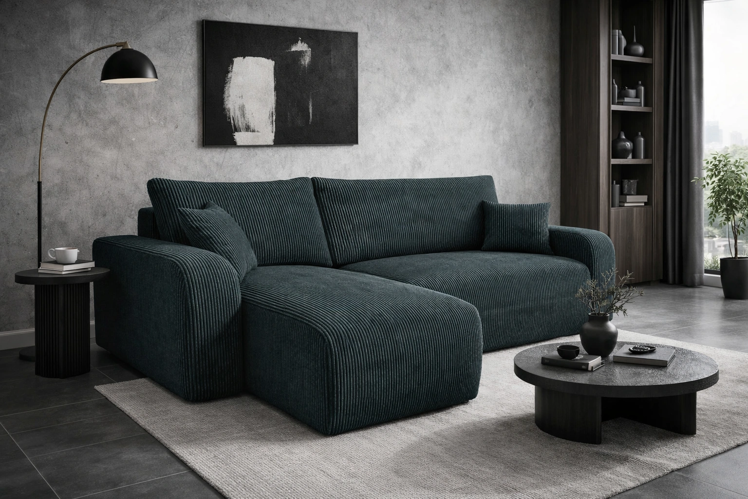 Dreidimensional kordstoff mit seiner ausgeprägten und dicken Rippung verleiht ihm einen besonderen Charakter und einzigartige Schönheit. Der Stoff ist sehr weich und dennoch stark und robust. Der Poso-Polsterungsstoff ist widerstandsfähig gegen Abrieb, und leicht sauber zu halten. Dank dessen wird die Fiesta-Klappecke lange Zeit ästhetisch und elegant aussehen. Das Ecksofa mit täglicher Schlaffunktion ist aus hochwertigen Materialien gefertigt, die gegen äußere Einflüsse wie Möbelbezüge und verschiedene Arten von Stößen resistent sind.