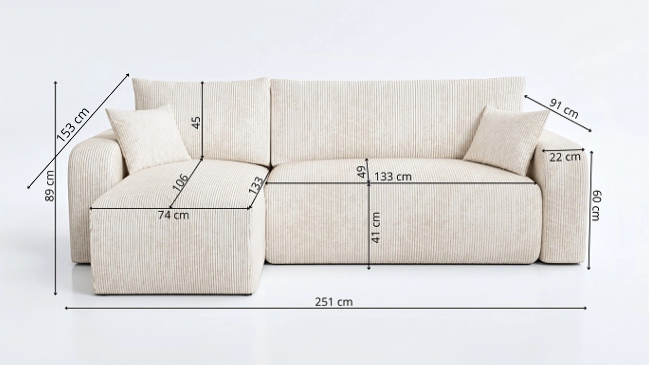 Das Ecksofa mit Schlaffunktion eignet sich dank seiner Abmessungen und seiner breiten Funktionalität ideal als Ecksofa für das Wohnzimmer oder als klappbares Ecksofa für das Gästezimmer. Ein Ecksofa mit Schlaffunktion ist auch eine gute Alternative zu einem Bett im Zimmer der jugendzimmer. Breite der Ecke 251 cm, höhe 89 cm und Tiefe 153 cm. Die Liegefläche des Eckschrankes beträgt 133x207 cm. Die Sitzhöhe des Möbels beträgt 41 cm, und die Höhe der Rückenlehne beträgt 45 cm. Gewellte Federn und T28-Polyurethanschaum ist das Material, aus dem der Sitz der Ecke hergestellt ist. Weich rückenlehnen-Kissen gewährleisten einen hohen Komfort bei der täglichen Erholung, den Sie und Ihre Gäste, die auf diesem einzigartigen Ecksofa sitzen, zu schätzen wissen werden.