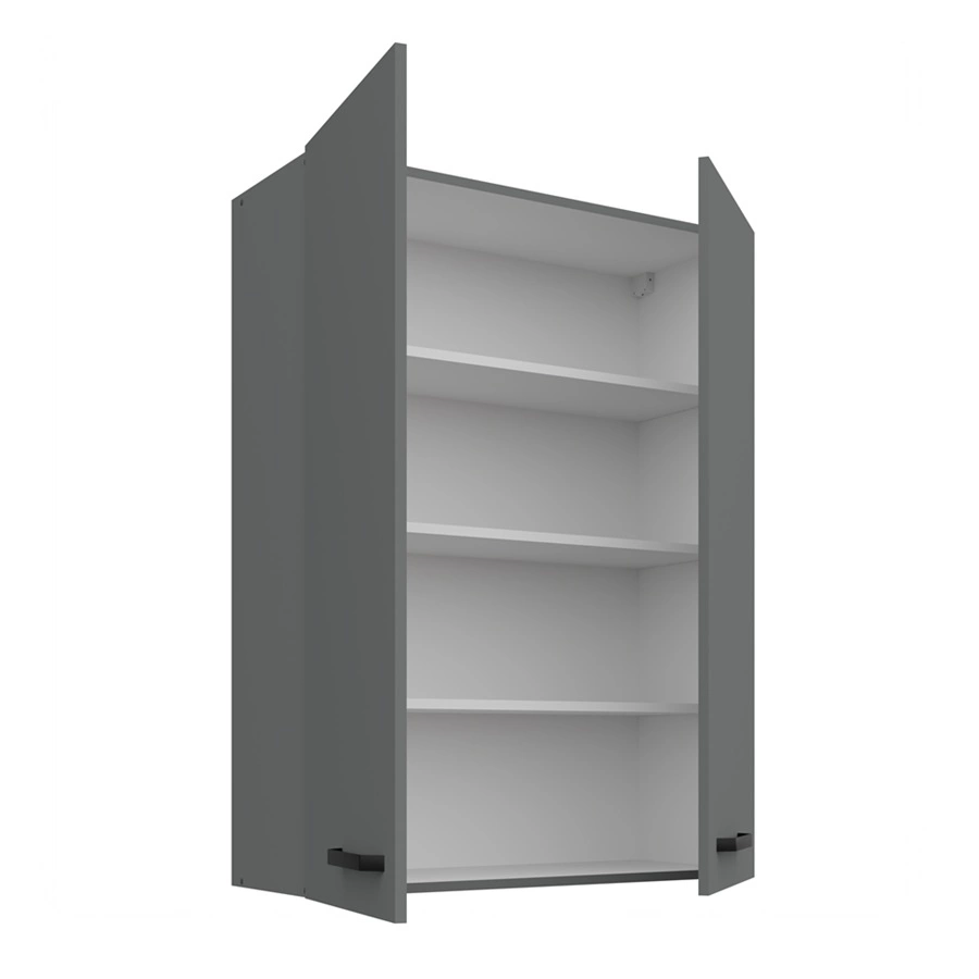 Der anthrazitfarbene Küchenschrankkorpus ist aus hochwertiger laminierter Platte 16 mm dick. Der Vorteil dieser Art von Platten ist hohe Widerstandsfähigkeit gegen äußere Einflüsse wie Dampf, Hitze, verschüttete Flüssigkeiten. ABS-Furnierkanten erhöhen die Haltbarkeit des Küchenschranks.