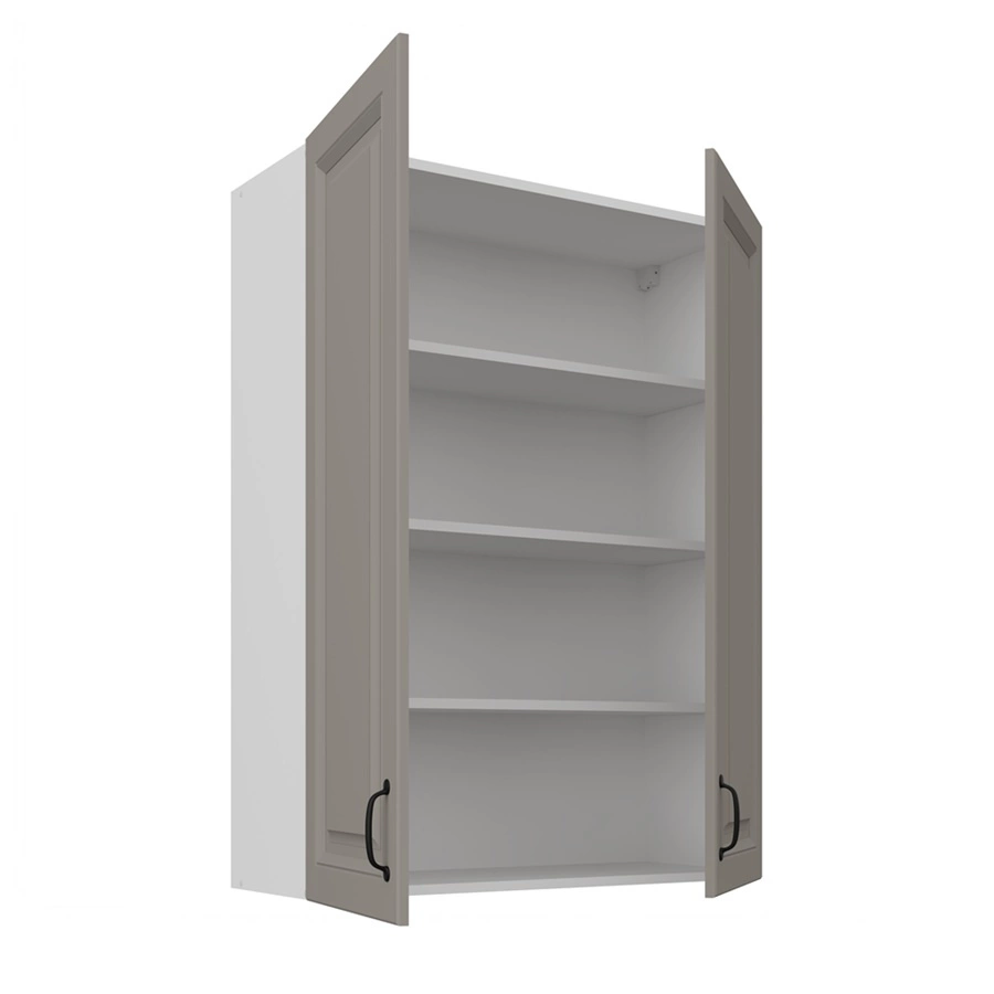 Der Küchenoberschrank wird in den Elementen geliefert, die in einem fünfschichtigen Karton verpackt sind. Alle für die Montage erforderlichen Beschläge, d.h. Schrauben, Bolzen, Dübel, Scharniere, Griffe, Dübel, werden zusammen mit den Küchenschrankkomponenten verpackt.