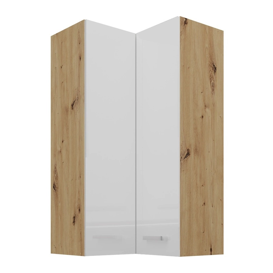 Der Eck-Hängeschrank Alpine in Weiß / Eiche artisan gehört zur Kategorie der modularen Küchenmöbel, aus denen jedes beliebige Set zusammengestellt werden kann.