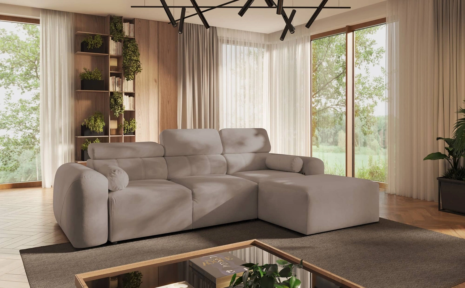 - Cantare Ecksofa mit modernem und elegantem Design. Das Sofa ist komplett aus flauschigem Plüschstoff mit zarter Textur gefertigt, der dem Interieur eine gemütliche und subtile Note verleiht. Der Einstreubehälter ist ein weiterer Vorteil des Blocks.
