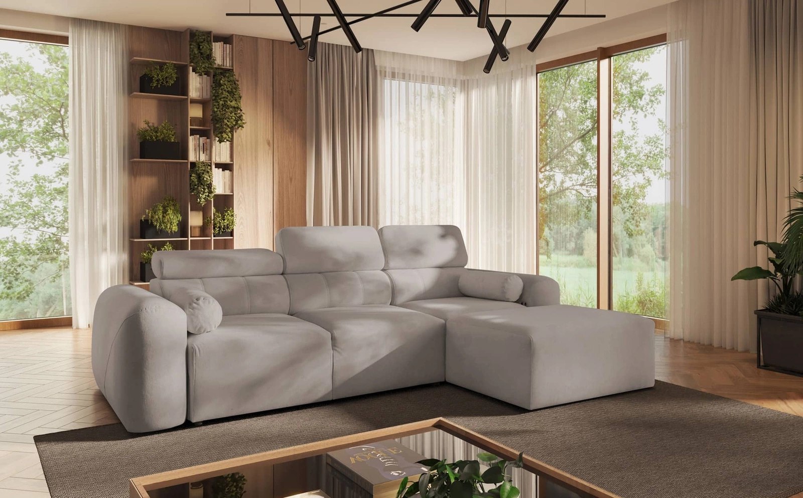 - Cantare Ecksofa mit modernem und elegantem Design. Das Sofa ist komplett aus flauschigem Plüschstoff mit zarter Textur gefertigt, der dem Interieur eine gemütliche und subtile Note verleiht. Der Einstreubehälter ist ein weiterer Vorteil des Blocks.