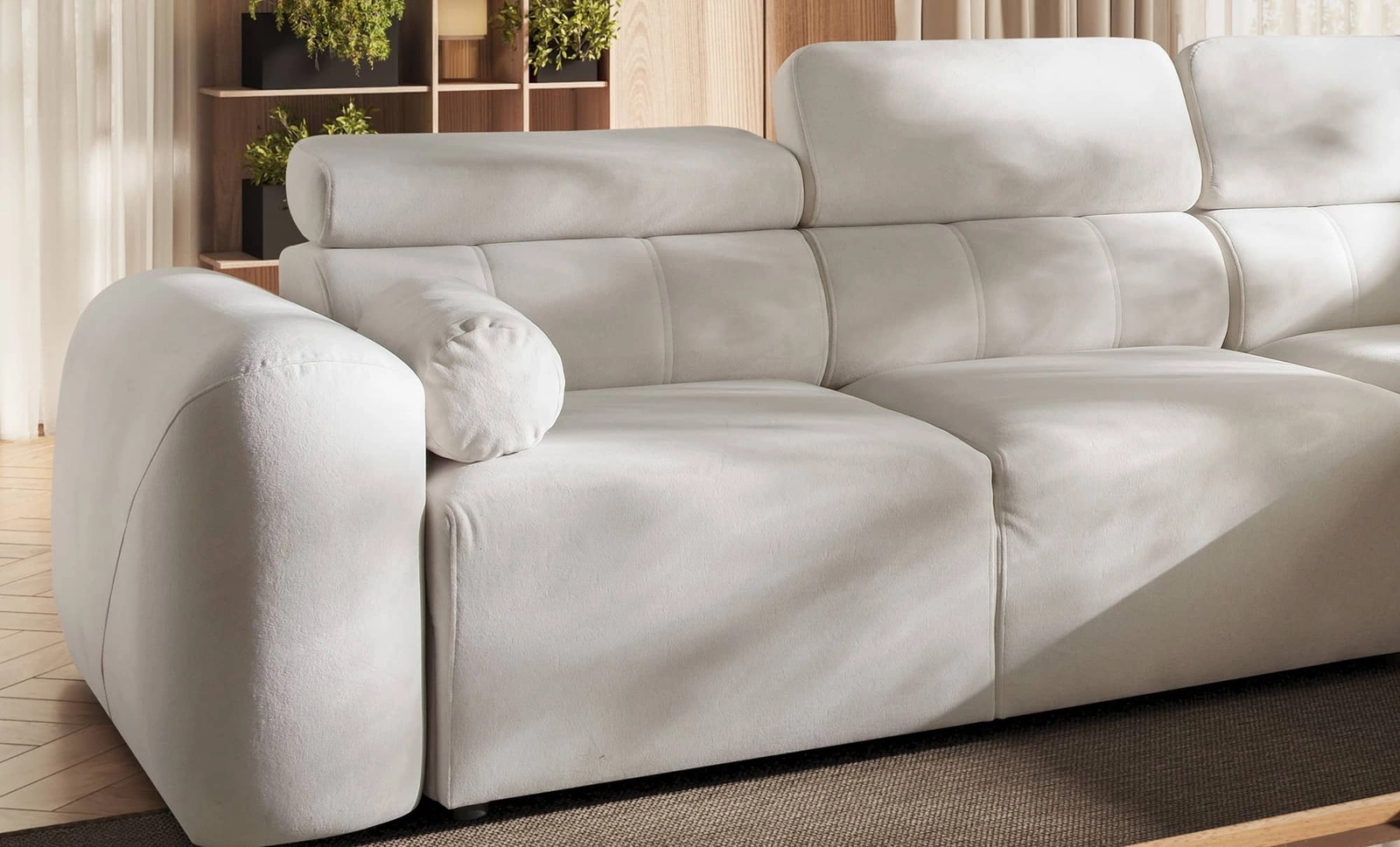- Cantare Ecksofa mit modernem und elegantem Design. Das Sofa ist komplett aus flauschigem Plüschstoff mit zarter Textur gefertigt, der dem Interieur eine gemütliche und subtile Note verleiht. Der Einstreubehälter ist ein weiterer Vorteil des Blocks.