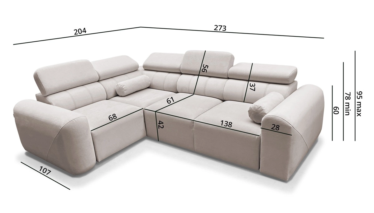 Die Abmessungen der Möbel ermöglichen platz in einem geräumigen Wohnzimmer oder Sitzungssaal zu schaffen. Breite der Ecke 273 cm, maximale Höhe 95 cm und Tiefe 204 cm. Die Liegefläche des Eckschrankes beträgt 132x207 cm. Die Sitzhöhe des Möbels beträgt 42 cm und die maximale Höhe der Rückenlehne beträgt 56 cm. Gewellte Federn und T30-Polyurethanschaum ist das Material, aus dem der Sitz der Ecke hergestellt ist. Rückenlehne mit verstellbaren Kopfstützen ermöglicht es Ihnen, den Winkel der Kopfstützen nach Ihren Wünschen einzustellen und garantiert Ihnen eine bequeme Erholung nach einem langen Tag, die Sie, Ihre Lieben und auch Ihre Gäste, die auf diesem einzigartigen Ecksofa sitzen, zu schätzen wissen werden.