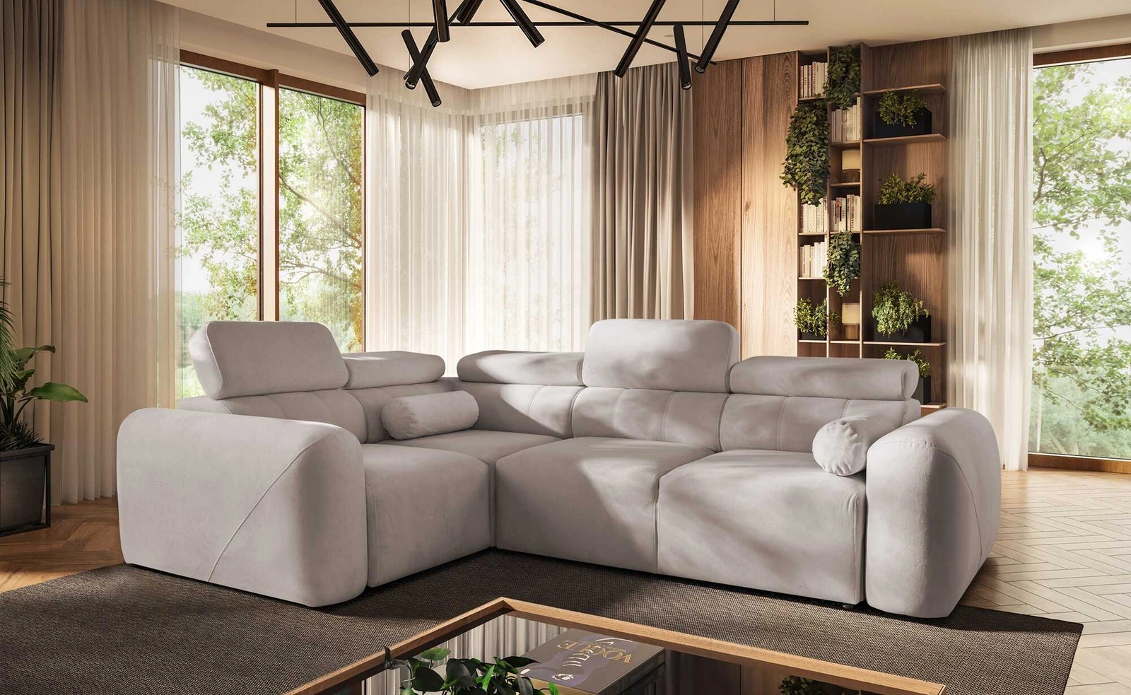 - Das Ecksofa Cantare II zeichnet sich durch ein modernes und stilvolles Design aus. Die Oberfläche der Ecke ist mit einem weichen, plüschigen, strukturierten Stoff überzogen, der dem Interieur einen subtilen Touch verleiht. Das einfach zu bedienende Entfal