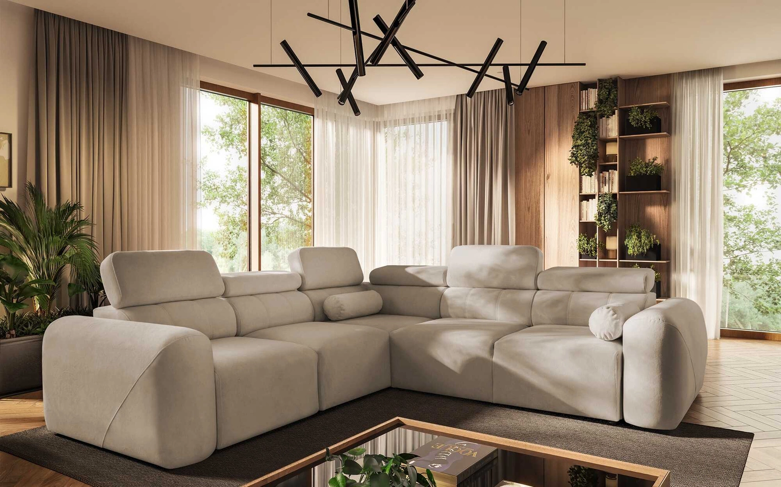 Ecksofa mit Schlaffunktion Cantare III beige links komfortables und stilvolles Ecksofa für das Wohnzimmer zwei Container für Bettzeug