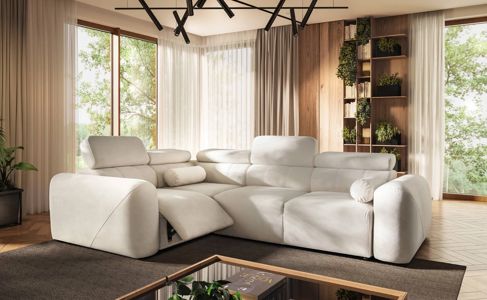 Ecksofa mit Schlaffunktion Cantare II Lux elfenbeinfarbenes Komfort-Ecksofa für die linke Seite mit hochklappbarem Fußteil weicher Stoff