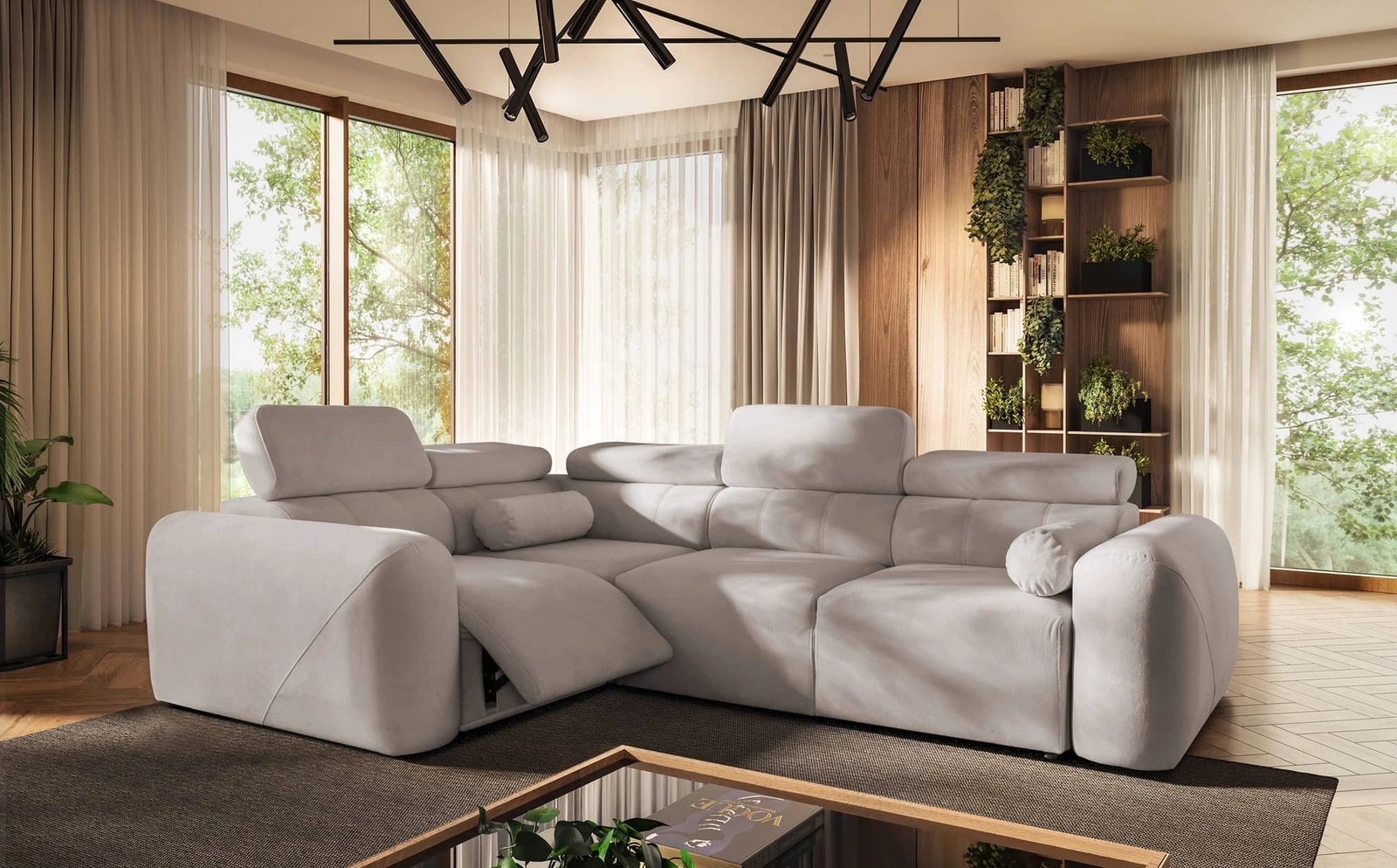 Eckeinheit mit Schlaffunktion Cantare II Lux verbindet Funktionalität mit einer äußerst stilvollen und eleganten Form. Der gesamte Körper war bedeckt mit stoff plüsch-Typ Torra 41063. Eckeinheit zeichnet sich aus durch interessantes Design, hohe Verarbeitungsqualität und die Hinzufügung von zierkissen, die noch mehr Komfort und Bequemlichkeit für diese hochmoderne Eckeinheit gewährleisten. Subtil, ziernaht unterstreichen den eleganten Charakter der Möbel und machen sie zu einer stilvollen Ergänzung für jeden Raum. Ein weiterer Vorteil der Ecke ist elektrisch hochgestellte Fußstütze, die einen komfortablen und erholsamen Aufenthalt gewährleisten. Dies ist eine hervorragende Lösung, die es Ihnen ermöglicht, den Raum optimal zu nutzen, ohne nach zusätzlichen Möbeln suchen zu müssen. Modernes eckdesign wird den höchsten Ansprüchen an Funktionalität und Design gerecht.