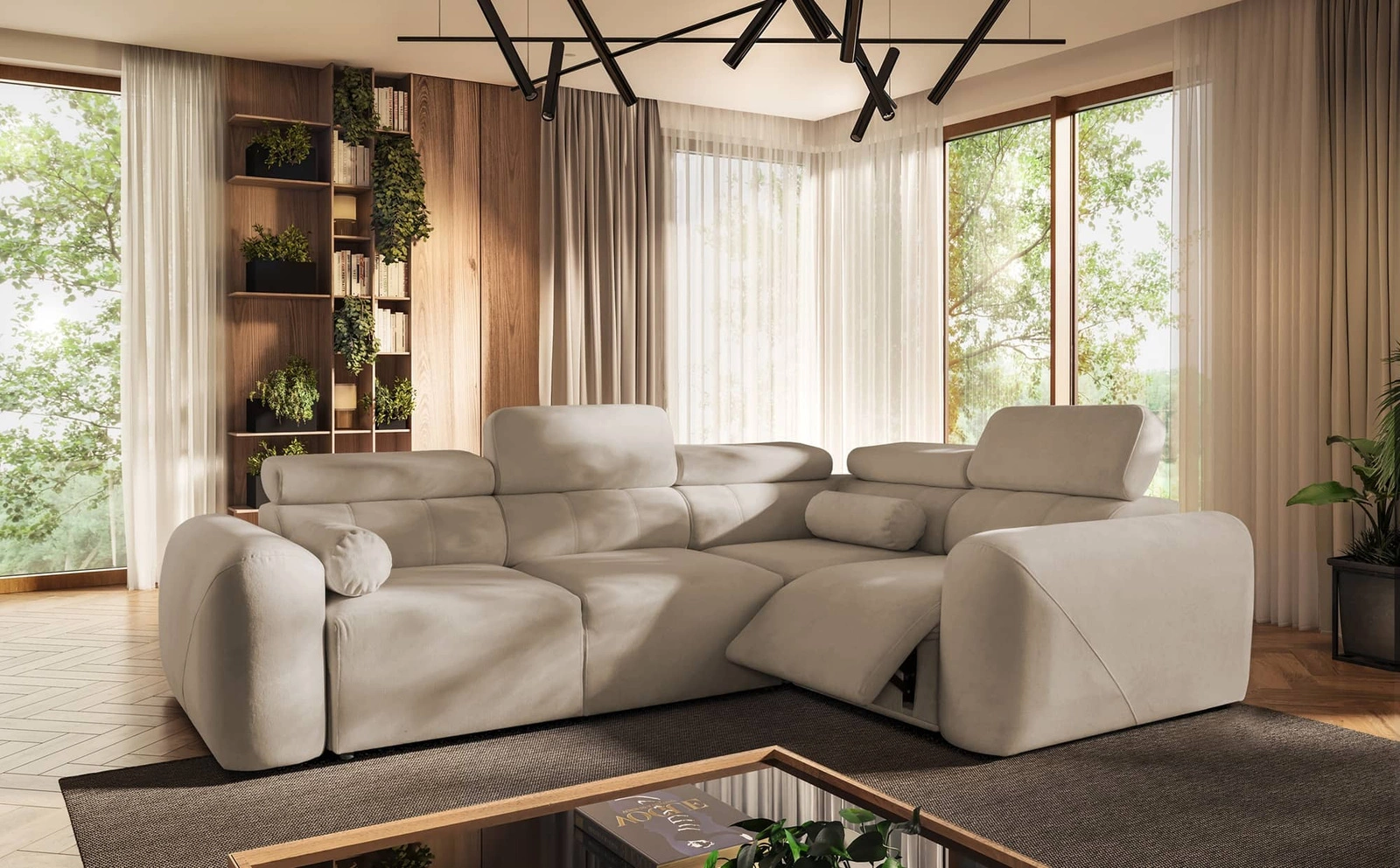 - Cantare II Lux Ecksofa mit stilvollem Design. Die Oberfläche der Ecke wurde mit einem Plüschstoff mit feiner Struktur überzogen, der der Ecke einen subtilen Touch verleiht. Die zusätzliche anhebbare Fußstütze sorgt für eine bequeme und entspannende Erholu