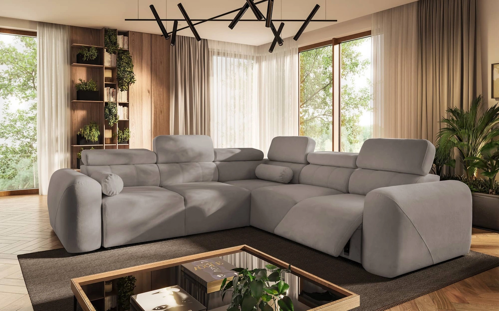 Eckeinheit mit Schlaffunktion Cantare III Lux verbindet Funktionalität mit einer äußerst stilvollen und eleganten Form. Der gesamte Körper war bedeckt mit stoff plüsch-Typ Torra 41043. Eckeinheit zeichnet sich aus durch interessantes Design, hohe Verarbeitungsqualität und die Hinzufügung von zierkissen, die noch mehr Komfort und Bequemlichkeit für diese hochmoderne Eckeinheit gewährleisten. Subtil, ziernaht unterstreichen den eleganten Charakter der Möbel und machen sie zu einer stilvollen Ergänzung für jeden Raum. Ein weiterer Vorteil der Ecke ist elektrisch hochgestellte Fußstütze, die einen komfortablen und erholsamen Aufenthalt gewährleisten. Dies ist eine hervorragende Lösung, die es Ihnen ermöglicht, den Raum optimal zu nutzen, ohne nach zusätzlichen Möbeln suchen zu müssen. Modernes eckdesign wird den höchsten Ansprüchen an Funktionalität und Design gerecht.