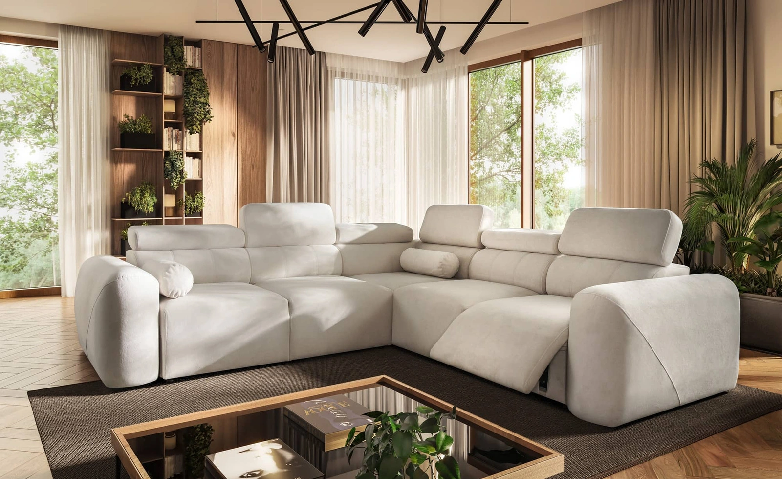 - Cantare III Lux Ecksofa mit stilvollem Design. Die Oberfläche der Ecke wurde mit einem Plüschstoff mit feiner Struktur überzogen, der der Ecke einen subtilen Touch verleiht. Die zusätzliche anhebbare Fußstütze sorgt für eine bequeme und entspannende Erhol