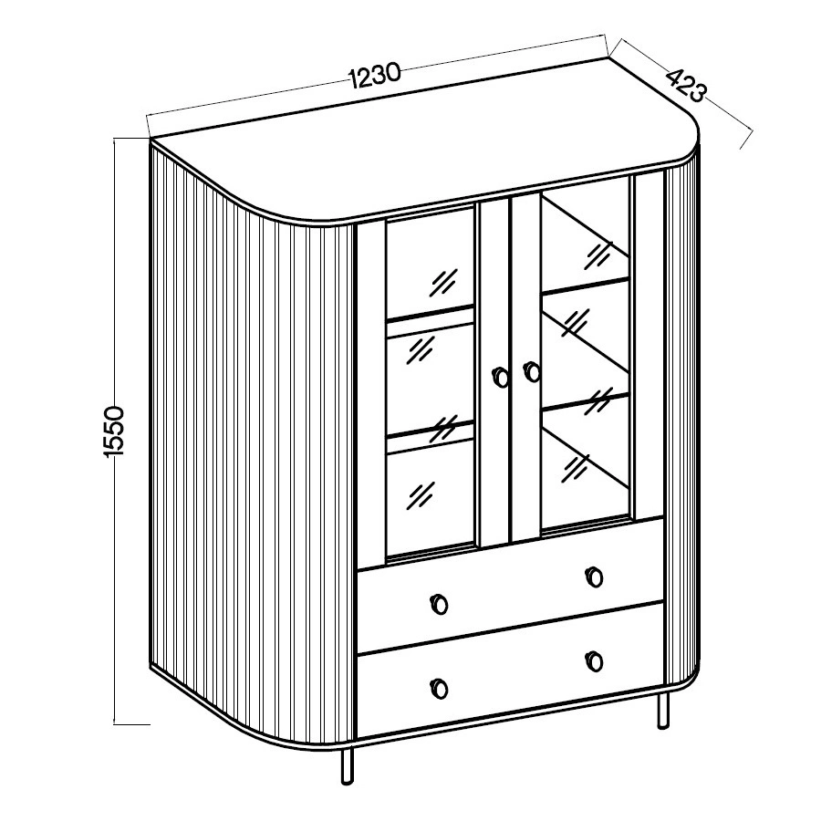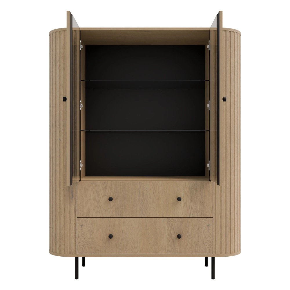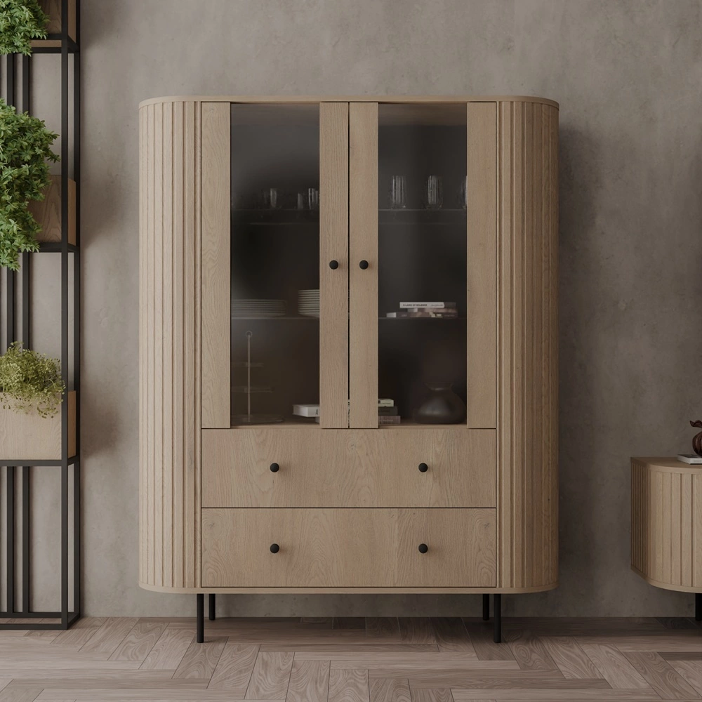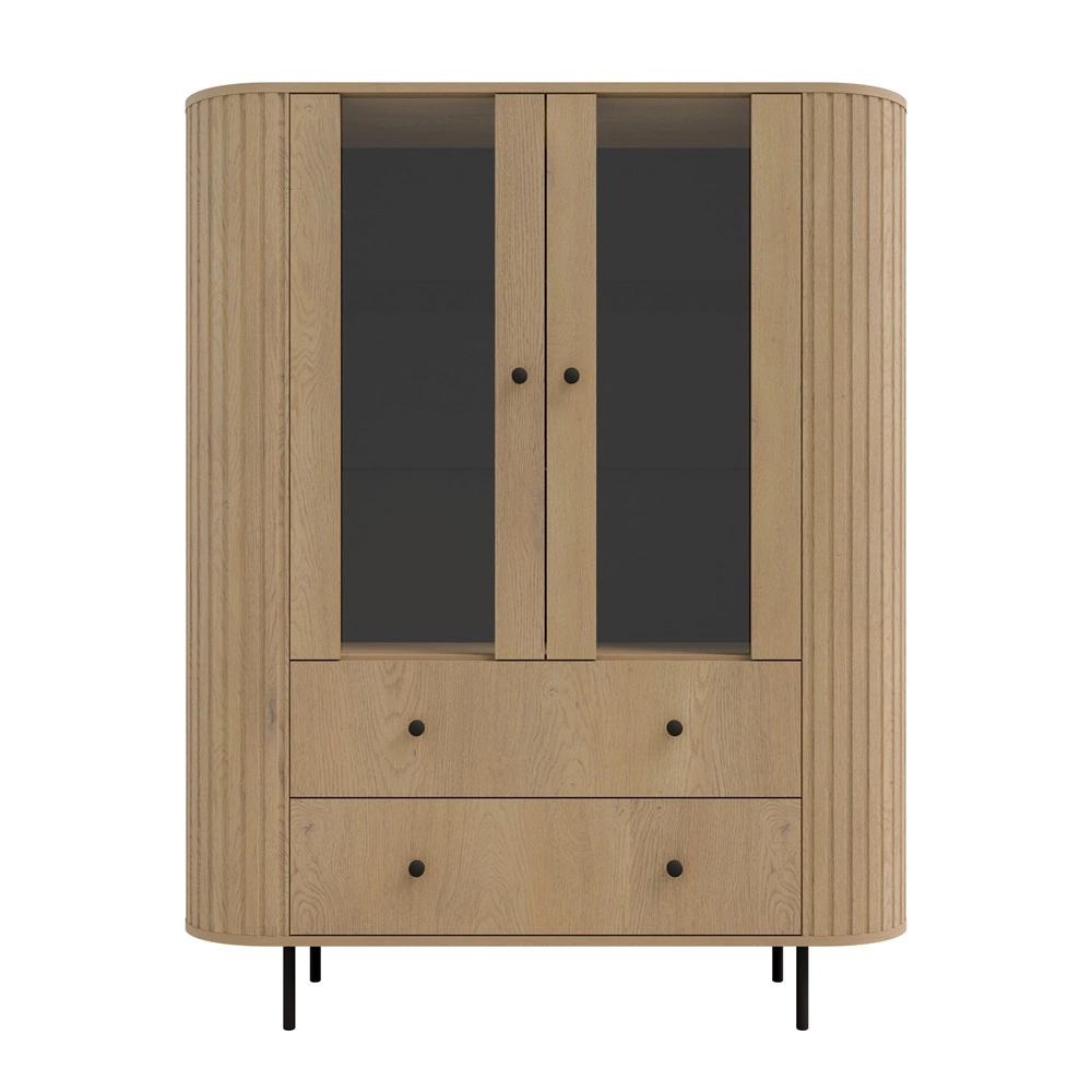 Vitrina Ovalio 123 cm Eiche cremona Designer Vitrine für Wohnzimmer mit ovaler Form und dekorativen Fräsungen geräumige Schubladen
