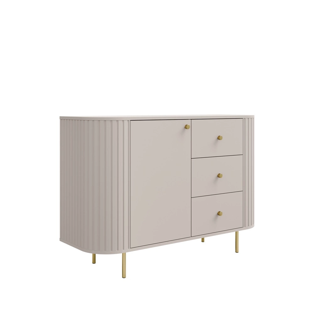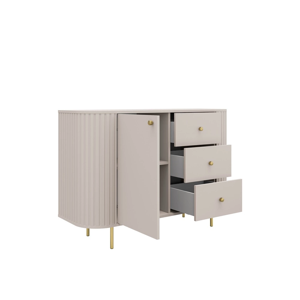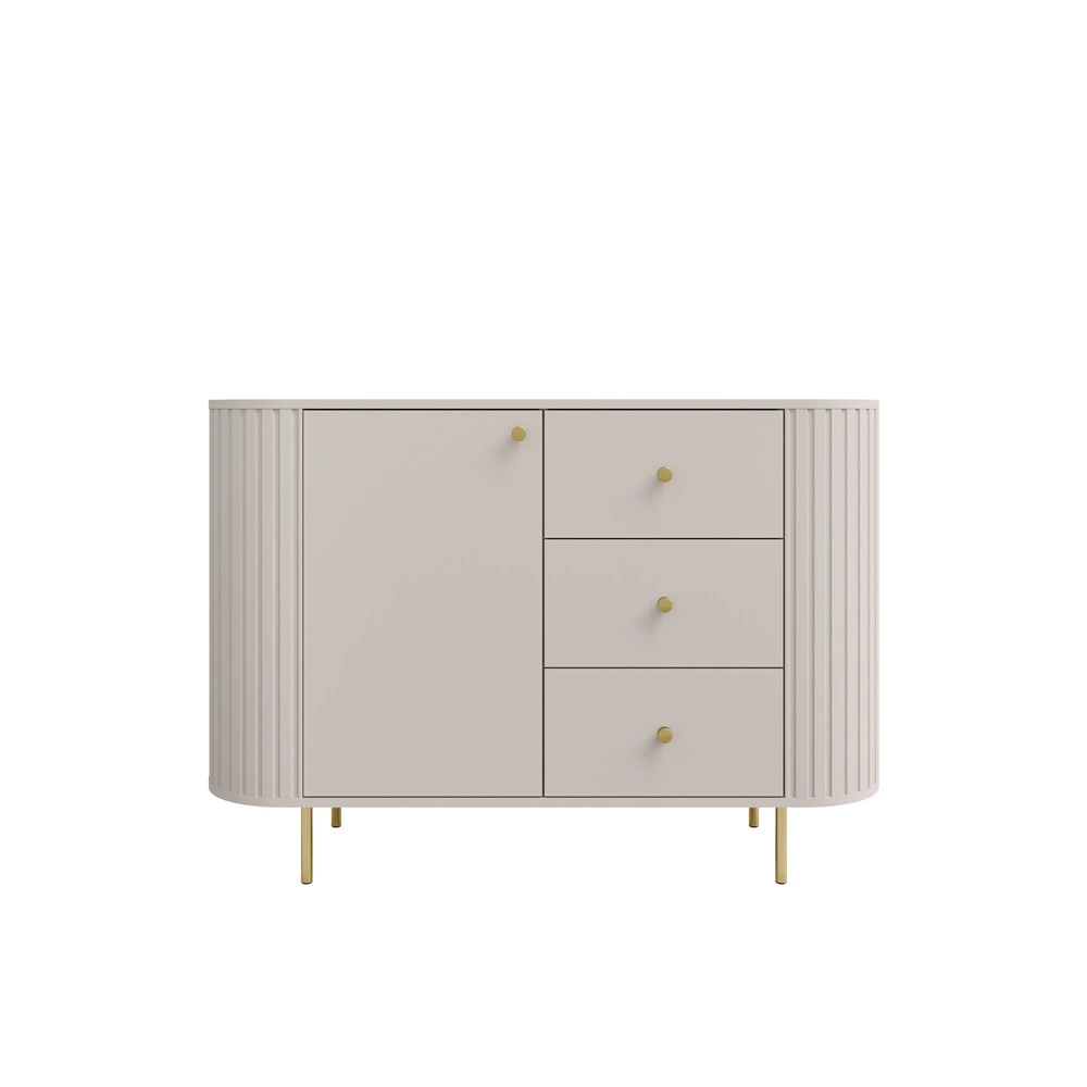 Die Kommode Ovalio 123 cm in Beige ist ein modernes Möbelstück, das durch seine Form und Ästhetik überrascht.