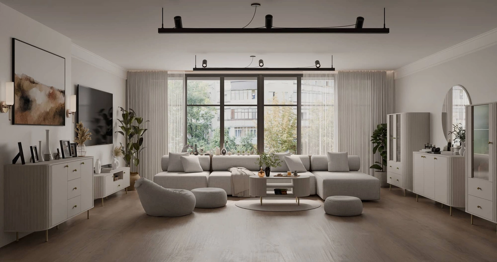 Der RTV-Schrank Ovalio 181 cm in Beige ist ein modernes Möbelstück, das durch seine Form und Ästhetik überrascht.
