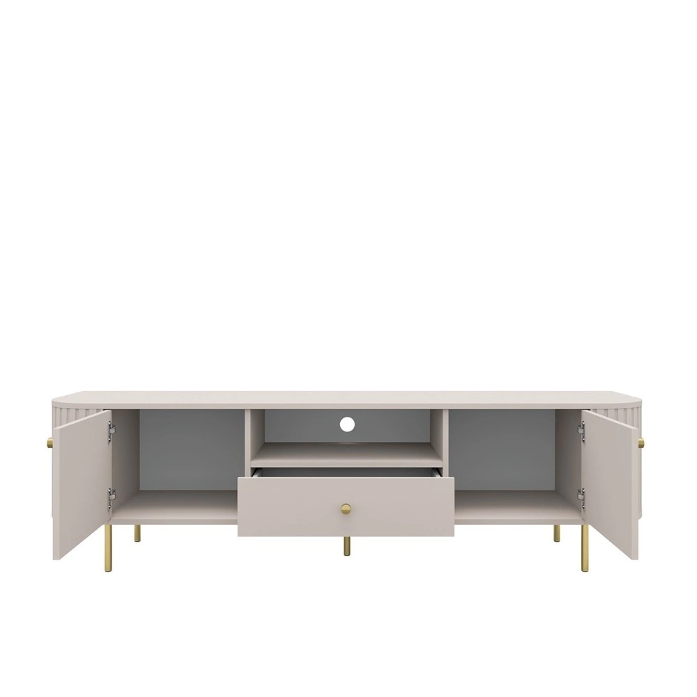 TV-Schrank Ovalio ist ein einzigartiges Möbelstück, bei dem modernes Design auf subtile Eleganz trifft. Abgerundete Formen und weiche Linien durch sorgfältiges Fräsen variiert bringen Leichtigkeit, Ruhe und Harmonie in den Innenraum und schaffen ein zeitloses Design. Das trendige Beige in einem sandigen Farbton wird durch goldene Metallic-Akzente aufgewertet die leuchtenden Farben des RTV-Schranks werden gebrochen, ohne die leichte Form des Schranks zu überwältigen. Der Ovalio TV-Schrank ist die ideale Wahl für alle, die Wert auf Ästhetik, Funktionalität und zeitlosen Stil legen.