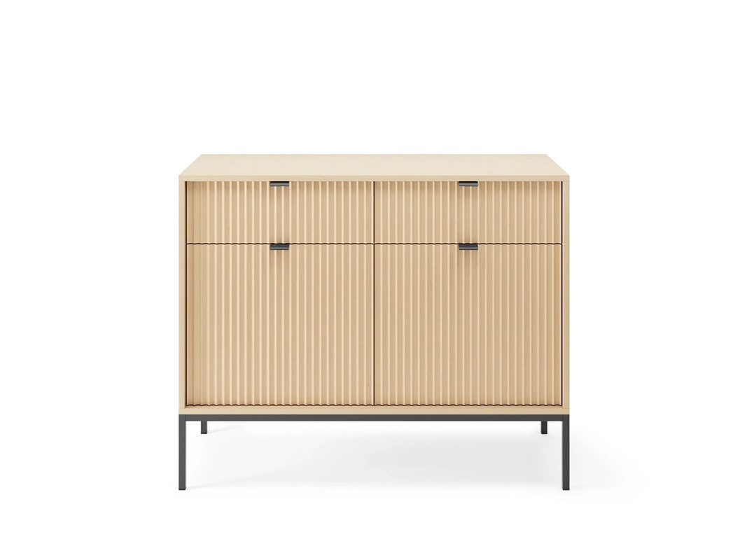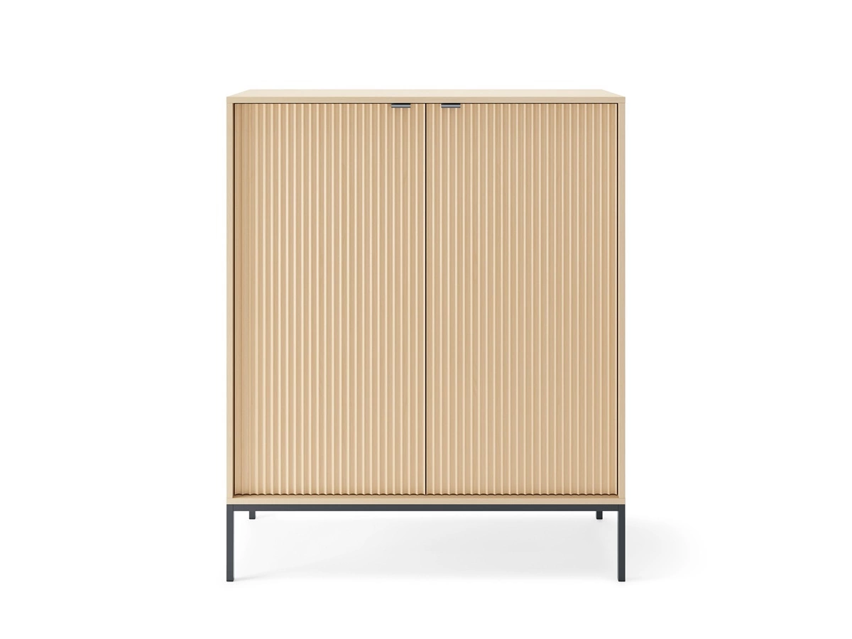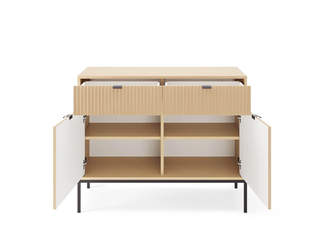 Möbelset Lovro Eiche Vicenza Designer Wohnwand dekorative geriffelte Fronten massiv auf einem Metallsockel gesetzt