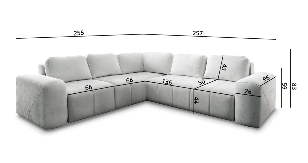 Die Abmessungen der Möbel ermöglichen platz in einem geräumigen Wohnzimmer oder Sitzungssaal zu schaffen. Breite der Ecke 257 cm, höhe 83 cm und Tiefe 255 cm. Die Liegefläche des Eckschrankes beträgt 125x205 cm. Die Sitzhöhe des Möbels beträgt 44 cm und die Höhe der Rückenlehne beträgt 43 cm. Gewellte Federn und T30-Polyurethanschaum ist das Material, aus dem der Sitz der Ecke hergestellt ist. Weich rückenlehnen-Kissen sorgen für hohen Komfort bei der täglichen Erholungden Sie und Ihre Gäste schätzen werden, wenn Sie auf diesem einzigartigen Ecksofa sitzen.