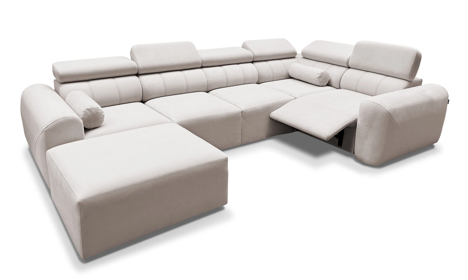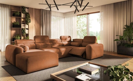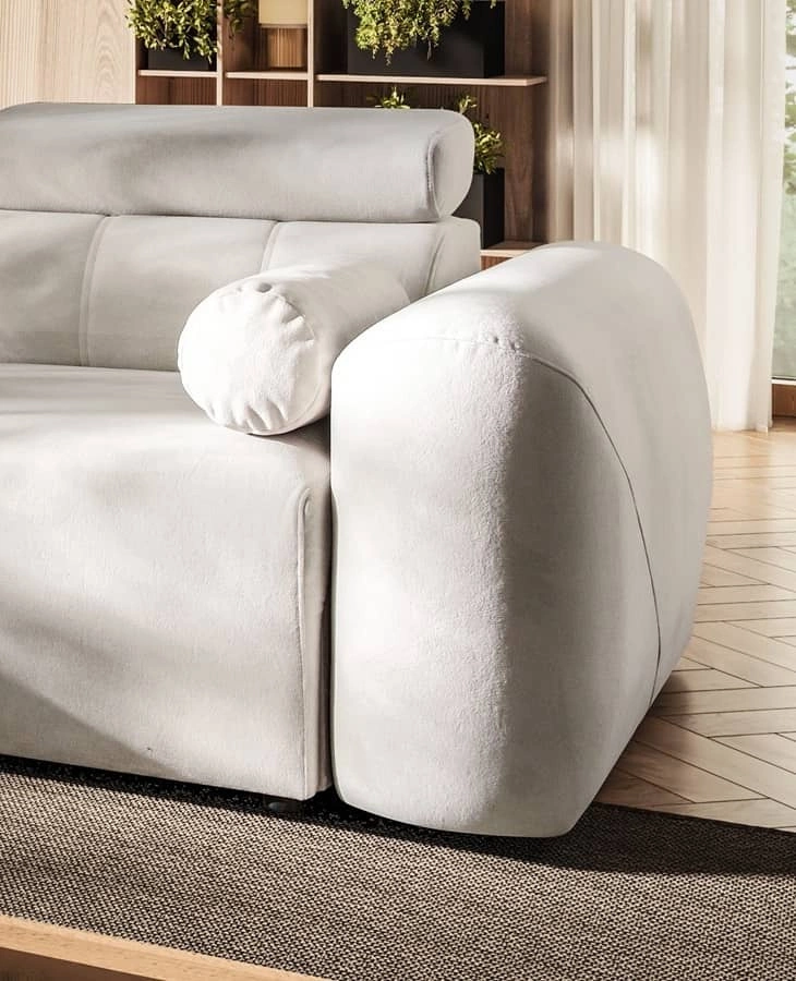 Die Abmessungen der Möbel ermöglichen platz in einem geräumigen Wohnzimmer oder Sitzungssaal zu schaffen. Breite der Ecke 343 cm, maximale Höhe 95 cm und Tiefe 202 cm. Die Liegefläche der Eckeinheit beträgt 132x268 cm. Die Sitzhöhe des Möbels beträgt 42 cm und die maximale Höhe der Rückenlehne beträgt 56 cm. Gewellte Federn und T30-Polyurethanschaum ist das Material, aus dem der Sitz der Ecke hergestellt ist. Rückenlehne mit verstellbaren Kopfstützen ermöglicht es Ihnen, den Winkel der Kopfstützen nach Ihren Wünschen einzustellen und garantiert Ihnen eine bequeme Erholung nach einem langen Tag, die Sie, Ihre Lieben und auch Ihre Gäste, die auf diesem einzigartigen Ecksofa sitzen, zu schätzen wissen werden.