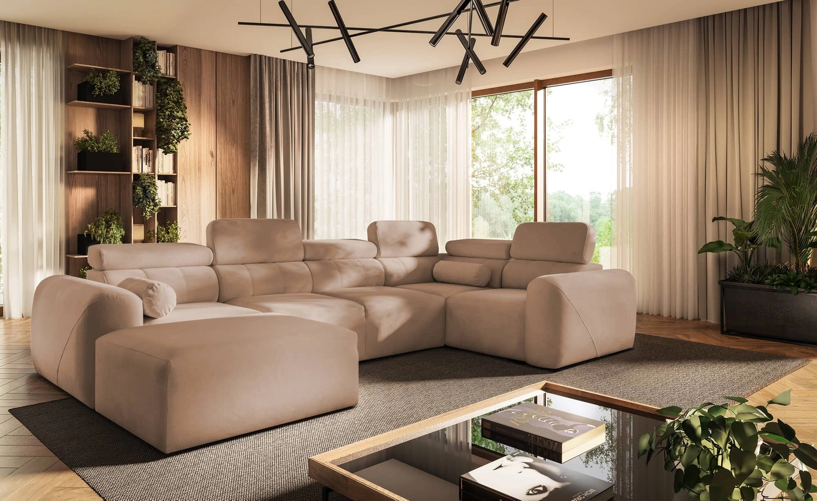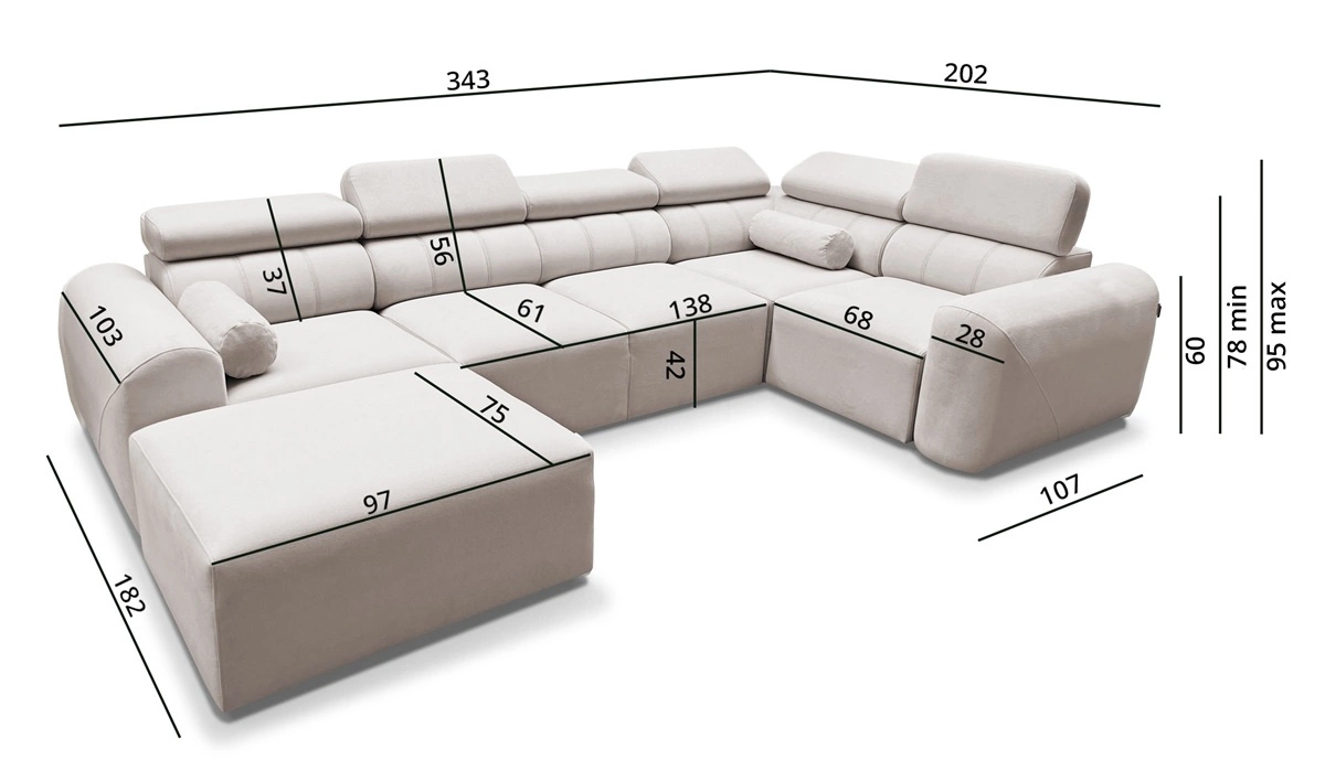 Die Abmessungen der Möbel ermöglichen platz in einem geräumigen Wohnzimmer oder Sitzungssaal zu schaffen. Breite der Ecke 343 cm, maximale Höhe 95 cm und Tiefe 202 cm. Die Liegefläche der Eckeinheit beträgt 132x268 cm. Die Sitzhöhe des Möbels beträgt 42 cm und die maximale Höhe der Rückenlehne beträgt 56 cm. Gewellte Federn und T30-Polyurethanschaum ist das Material, aus dem der Sitz der Ecke hergestellt ist. Rückenlehne mit verstellbaren Kopfstützen ermöglicht es Ihnen, den Winkel der Kopfstützen nach Ihren Wünschen einzustellen und garantiert Ihnen eine bequeme Erholung nach einem langen Tag, die Sie, Ihre Lieben und auch Ihre Gäste, die auf diesem einzigartigen Ecksofa sitzen, zu schätzen wissen werden.