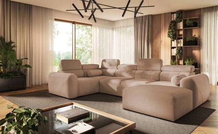Die Abmessungen der Möbel ermöglichen platz in einem geräumigen Wohnzimmer oder Sitzungssaal zu schaffen. Breite der Ecke 343 cm, maximale Höhe 95 cm und Tiefe 202 cm. Die Liegefläche der Eckeinheit beträgt 132x268 cm. Die Sitzhöhe des Möbels beträgt 42 cm und die maximale Höhe der Rückenlehne beträgt 56 cm. Gewellte Federn und T30-Polyurethanschaum ist das Material, aus dem der Sitz der Ecke hergestellt ist. Rückenlehne mit verstellbaren Kopfstützen ermöglicht es Ihnen, den Winkel der Kopfstützen nach Ihren Wünschen einzustellen und garantiert Ihnen eine bequeme Erholung nach einem langen Tag, die Sie, Ihre Lieben und auch Ihre Gäste, die auf diesem einzigartigen Ecksofa sitzen, zu schätzen wissen werden.