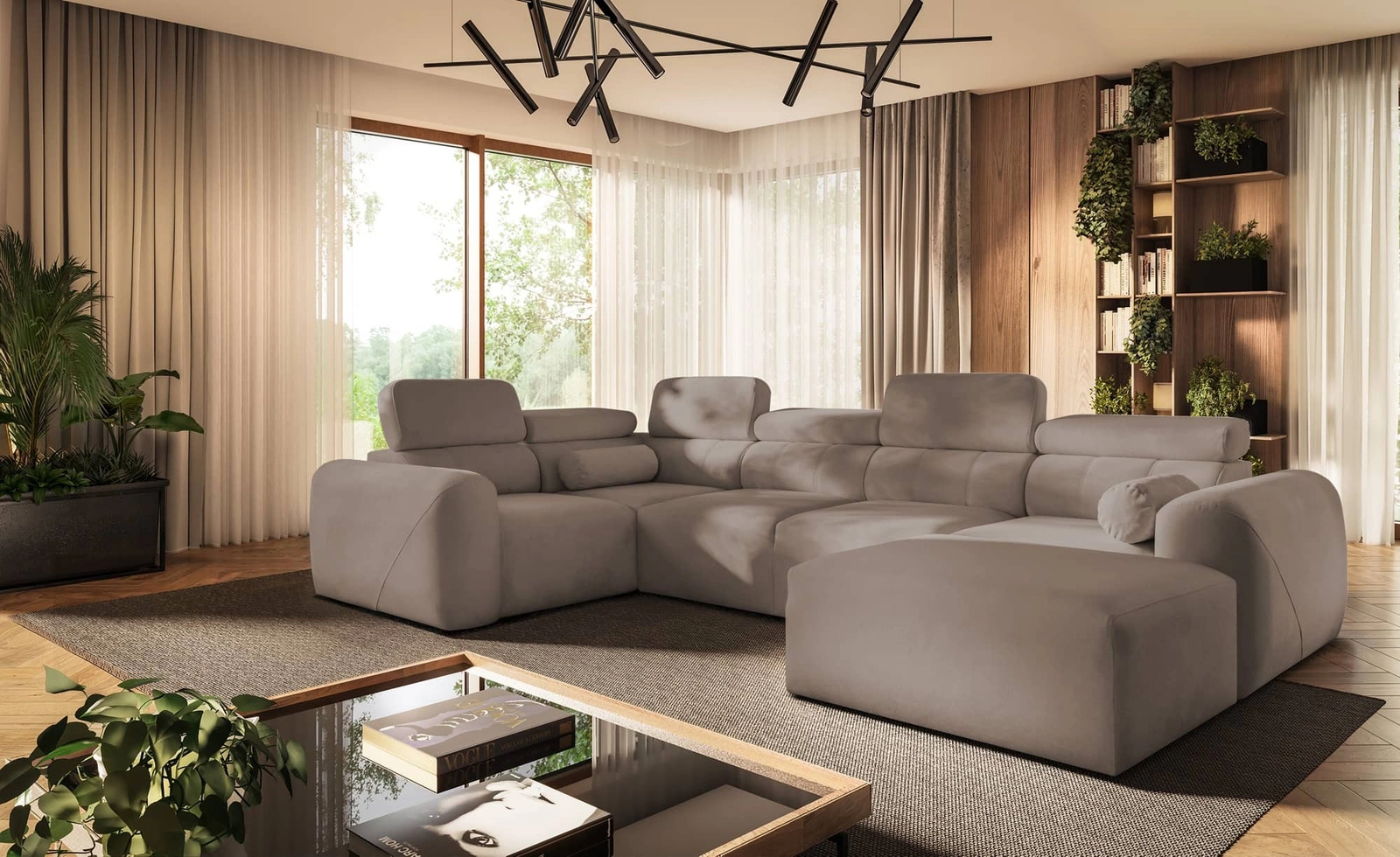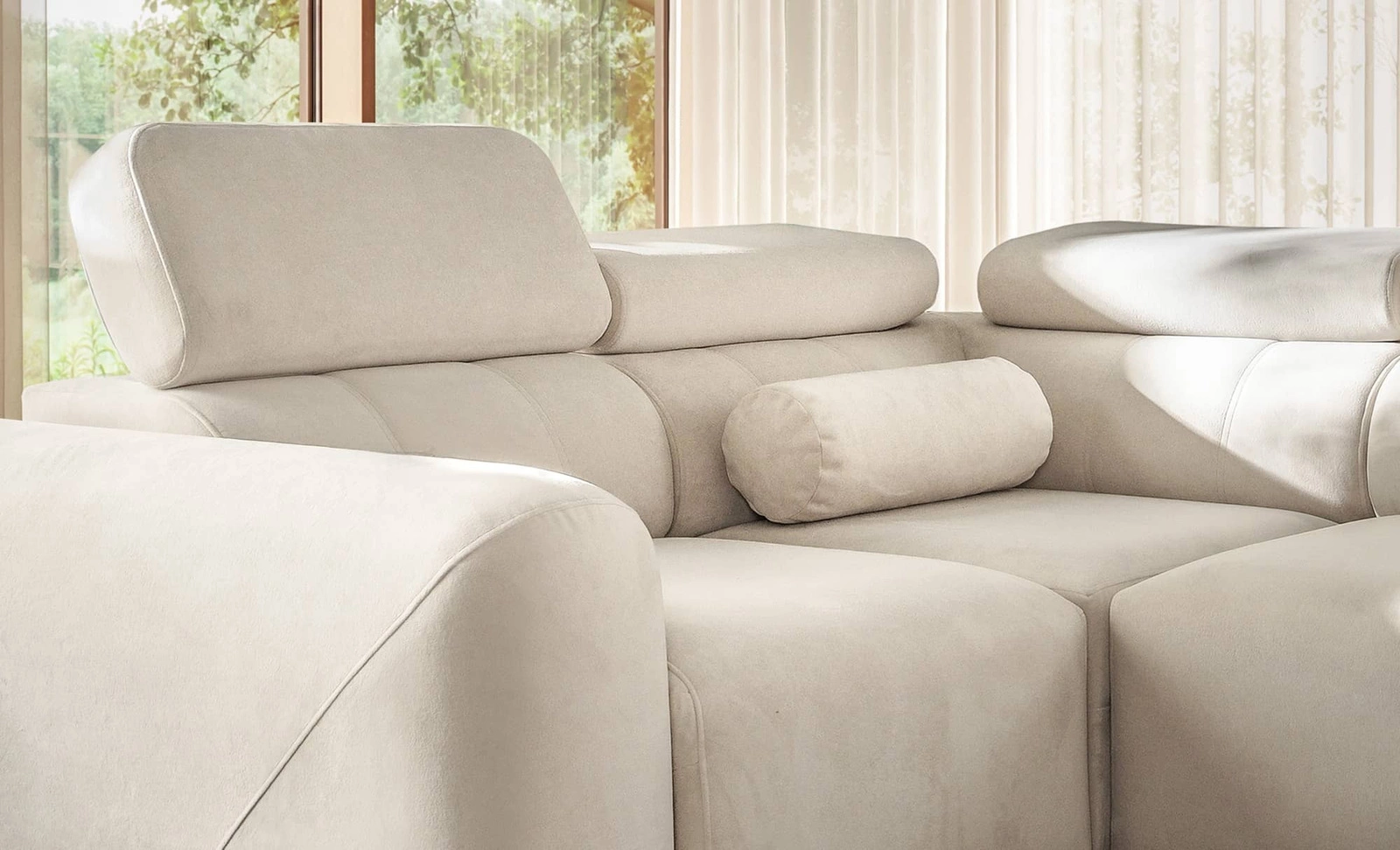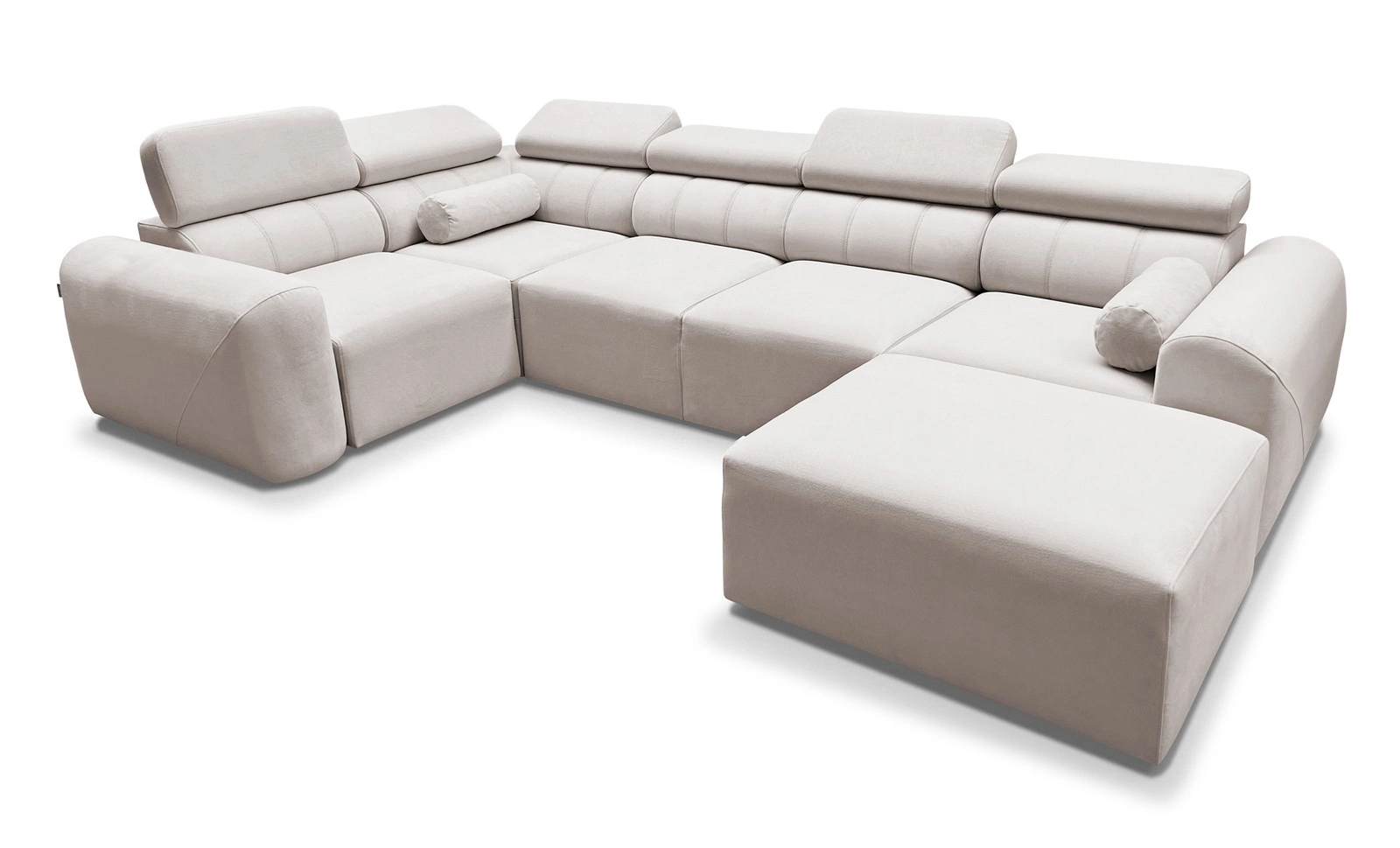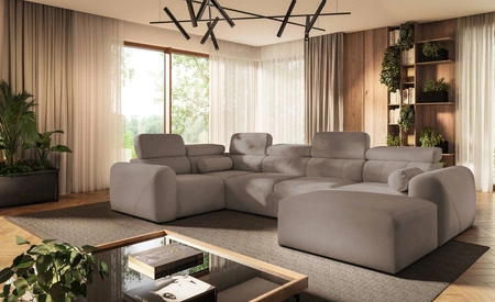 Die Abmessungen der Möbel ermöglichen platz in einem geräumigen Wohnzimmer oder Sitzungssaal zu schaffen. Breite der Ecke 343 cm, maximale Höhe 95 cm und Tiefe 202 cm. Die Liegefläche der Eckeinheit beträgt 132x268 cm. Die Sitzhöhe des Möbels beträgt 42 cm und die maximale Höhe der Rückenlehne beträgt 56 cm. Gewellte Federn und T30-Polyurethanschaum ist das Material, aus dem der Sitz der Ecke hergestellt ist. Rückenlehne mit verstellbaren Kopfstützen ermöglicht es Ihnen, den Winkel der Kopfstützen nach Ihren Wünschen einzustellen und garantiert Ihnen eine bequeme Erholung nach einem langen Tag, die Sie, Ihre Lieben und auch Ihre Gäste, die auf diesem einzigartigen Ecksofa sitzen, zu schätzen wissen werden.
