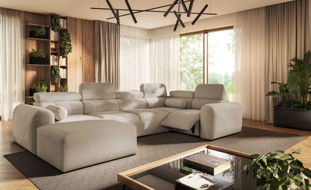 Die Abmessungen der Möbel ermöglichen platz in einem geräumigen Wohnzimmer oder Sitzungssaal zu schaffen. Breite der Ecke 343 cm, maximale Höhe 95 cm und Tiefe 202 cm. Die Liegefläche der Eckeinheit beträgt 132x268 cm. Die Sitzhöhe des Möbels beträgt 42 cm und die maximale Höhe der Rückenlehne beträgt 56 cm. Gewellte Federn und T30-Polyurethanschaum ist das Material, aus dem der Sitz der Ecke hergestellt ist. Rückenlehne mit verstellbaren Kopfstützen ermöglicht es Ihnen, den Winkel der Kopfstützen nach Ihren Wünschen einzustellen und garantiert Ihnen eine bequeme Erholung nach einem langen Tag, die Sie, Ihre Lieben und auch Ihre Gäste, die auf diesem einzigartigen Ecksofa sitzen, zu schätzen wissen werden.
