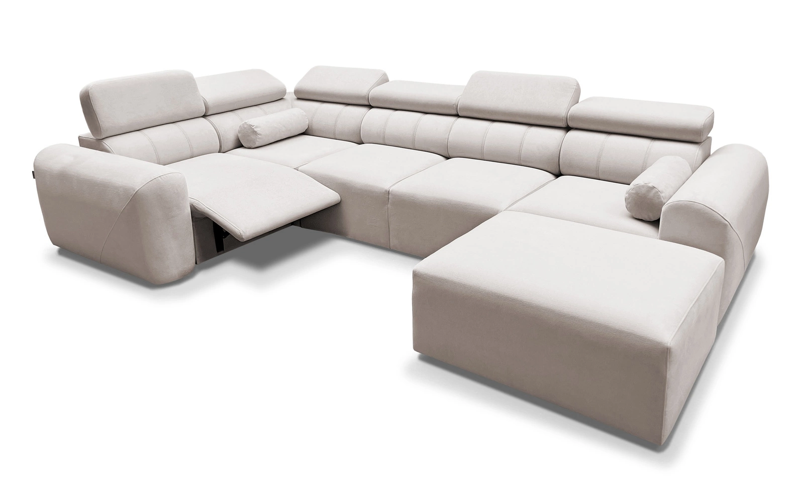 Die Abmessungen der Möbel ermöglichen platz in einem geräumigen Wohnzimmer oder Sitzungssaal zu schaffen. Breite der Ecke 343 cm, maximale Höhe 95 cm und Tiefe 202 cm. Die Liegefläche der Eckeinheit beträgt 132x268 cm. Die Sitzhöhe des Möbels beträgt 42 cm und die maximale Höhe der Rückenlehne beträgt 56 cm. Gewellte Federn und T30-Polyurethanschaum ist das Material, aus dem der Sitz der Ecke hergestellt ist. Rückenlehne mit verstellbaren Kopfstützen ermöglicht es Ihnen, den Winkel der Kopfstützen nach Ihren Wünschen einzustellen und garantiert Ihnen eine bequeme Erholung nach einem langen Tag, die Sie, Ihre Lieben und auch Ihre Gäste, die auf diesem einzigartigen Ecksofa sitzen, zu schätzen wissen werden.