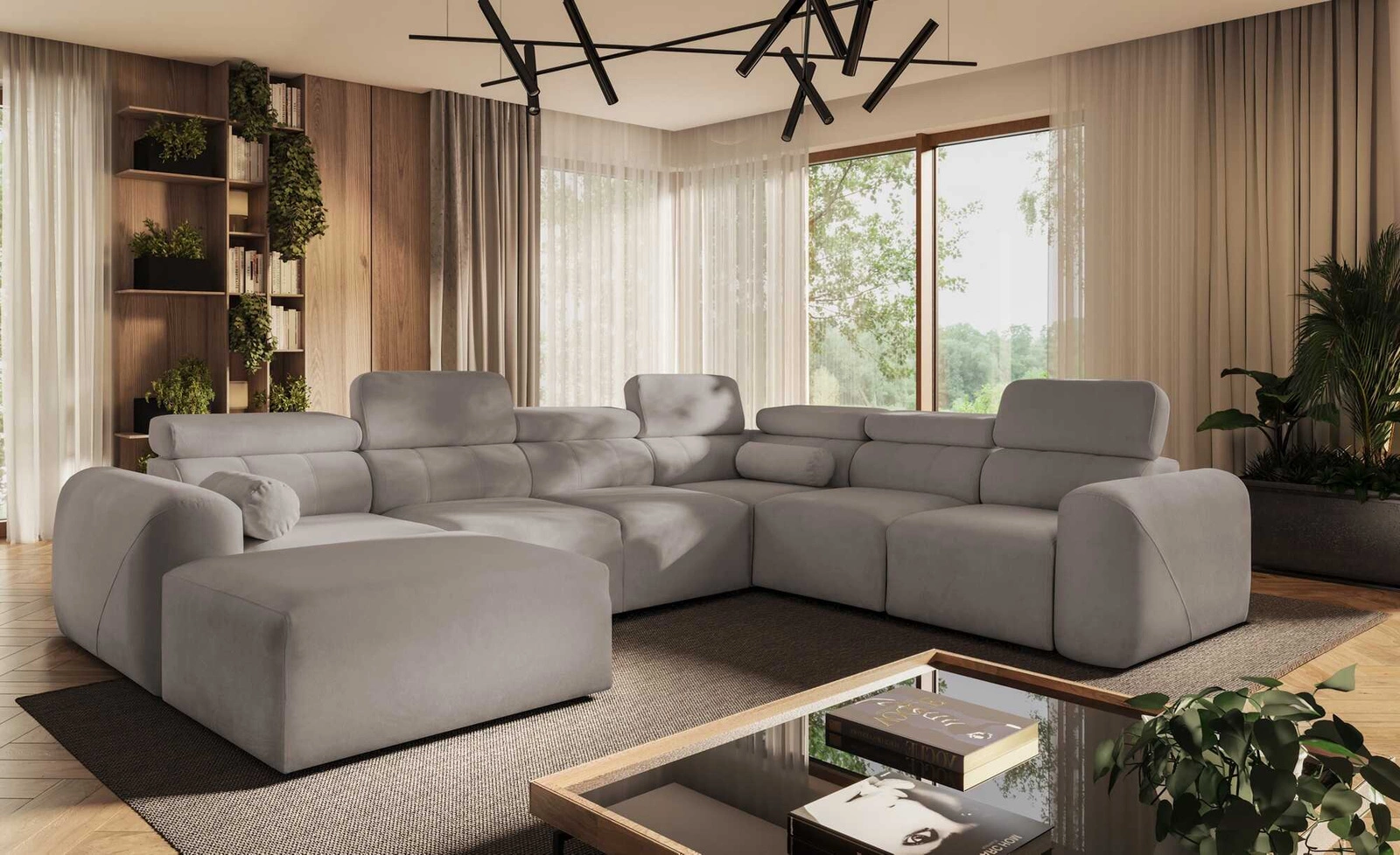 Ecksofa mit Schlaffunktion Cantare VIII graue Esche links geschmackvolles Ecksofa mit verstellbaren Kopfstützen Bettzeug Container