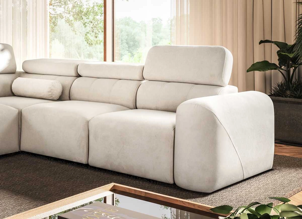 Die Abmessungen der Möbel ermöglichen platz in einem geräumigen Wohnzimmer oder Sitzungssaal zu schaffen. Breite der Ecke 343 cm, maximale Höhe 95 cm und Tiefe 272 cm. Die Liegefläche der Eckeinheit beträgt 132x268 cm. Die Sitzhöhe des Möbels beträgt 42 cm und die maximale Höhe der Rückenlehne beträgt 56 cm. Gewellte Federn und T30-Polyurethanschaum ist das Material, aus dem der Sitz der Ecke hergestellt ist. Rückenlehne mit verstellbaren Kopfstützen ermöglicht es Ihnen, den Winkel der Kopfstützen nach Ihren Wünschen einzustellen und garantiert Ihnen eine bequeme Erholung nach einem langen Tag, die Sie, Ihre Lieben und auch Ihre Gäste, die auf diesem einzigartigen Ecksofa sitzen, zu schätzen wissen werden.