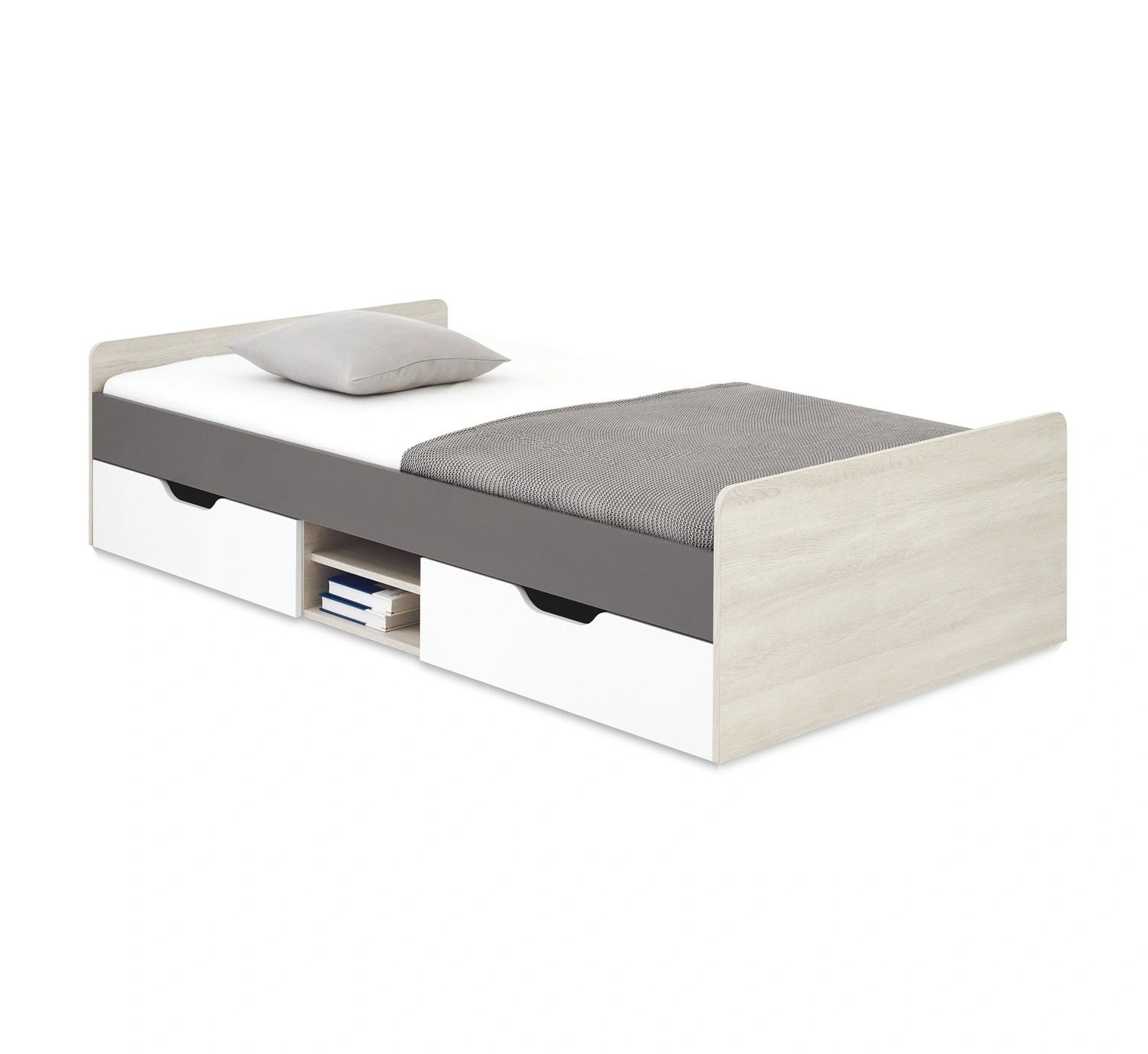 Das Bett mit Schubladen Remona 120x200 cm in Eiche wilton weiß / weiß / anthrazit ist ein Rezept für eine moderne und funktionelle Einrichtung eines Jugendzimmers.