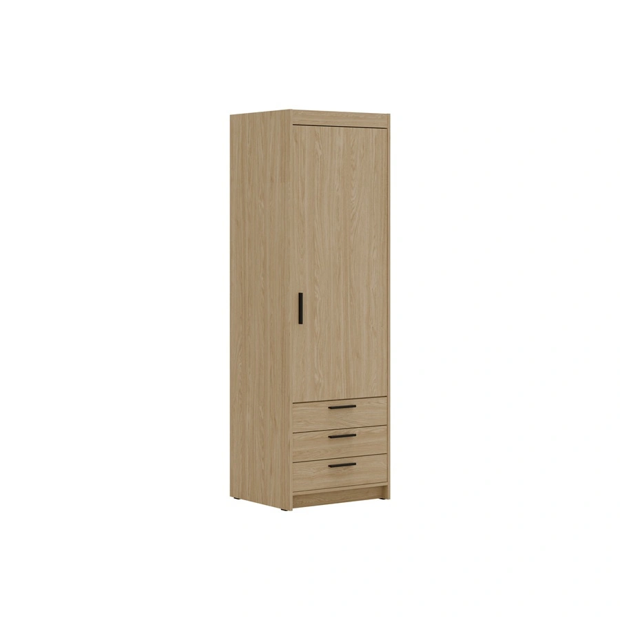Der Schrank besteht aus 1 Tür und 3 Schubladen. Die Garderobe garantiert bequem i problemlos nutzung und haltbarkeit des gesamten Möbelstücks für viele Jahre der Nutzung. Kombination aus aus Natureiche mit schwarzen Griffen macht den Schrank erfolgreich als Schlafzimmerschrank, als Dielenschrank oder als Kinderzimmergarderobe. Die modularen Kleiderschränke von Rene sind auch eine gute Wahl für ein Babyzimmer. Er eignet sich auch perfekt als Garderobe für den Flur.
